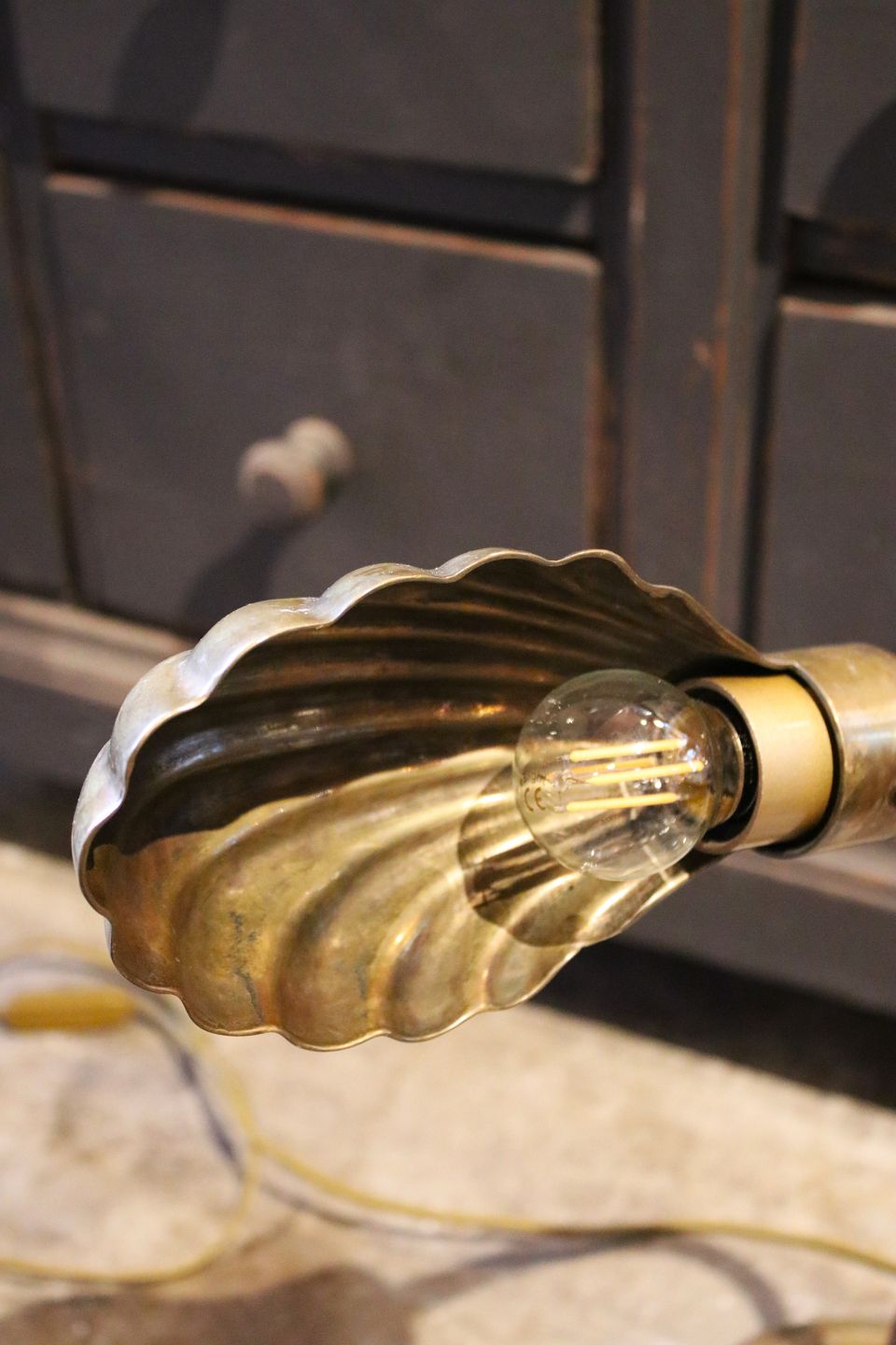 Gammel bordlampe i messing med musling formet skærm.