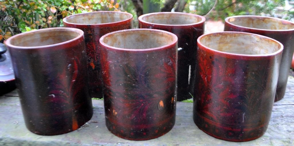 Samling russiske trædåser, 19. årh. Drejet og udhulet tre. Med udvendige bemalinger. Lakeret. Indvendig med sølvfarve.  I alt 5 stk.  NB: Sælges kun samlet!