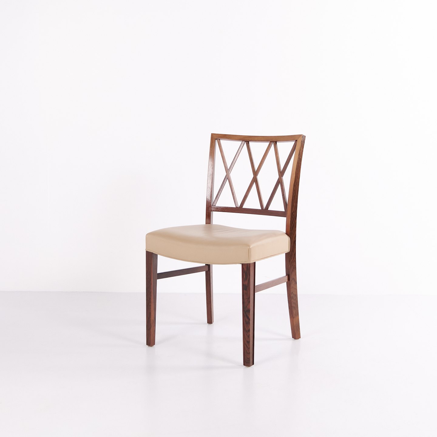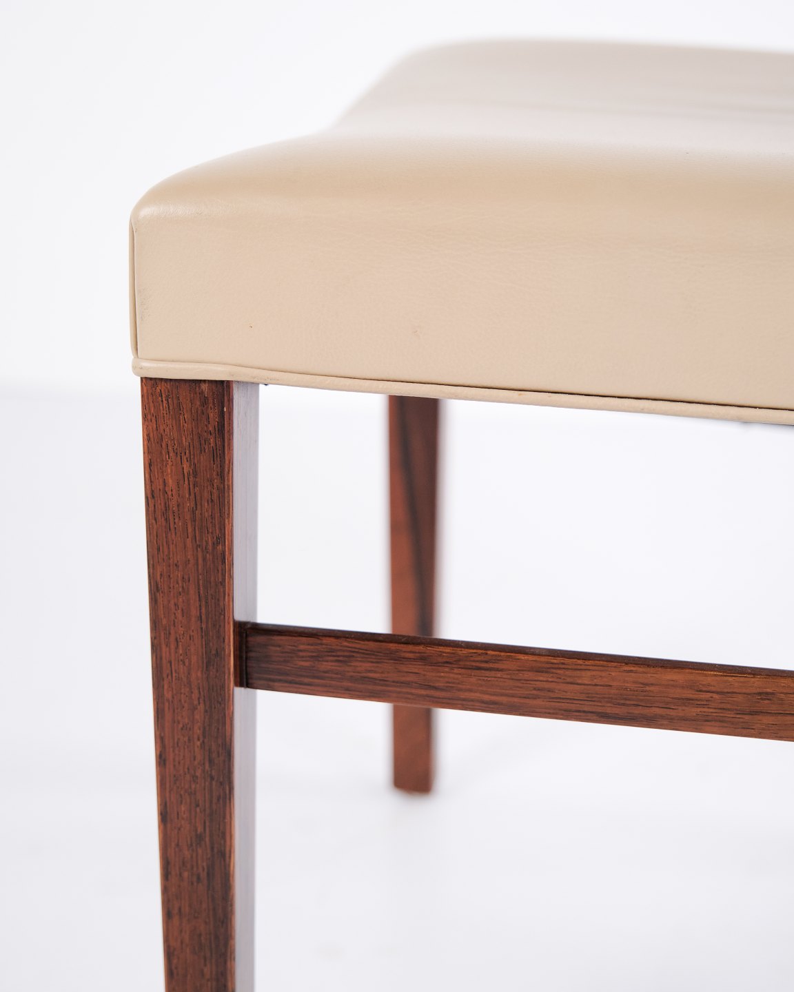 Sæt af fire spisebordsstole af Ole Wanscher for A.J. Iversen. Palisander og cremefarvet læder. Dansk design fra 1960’erne.