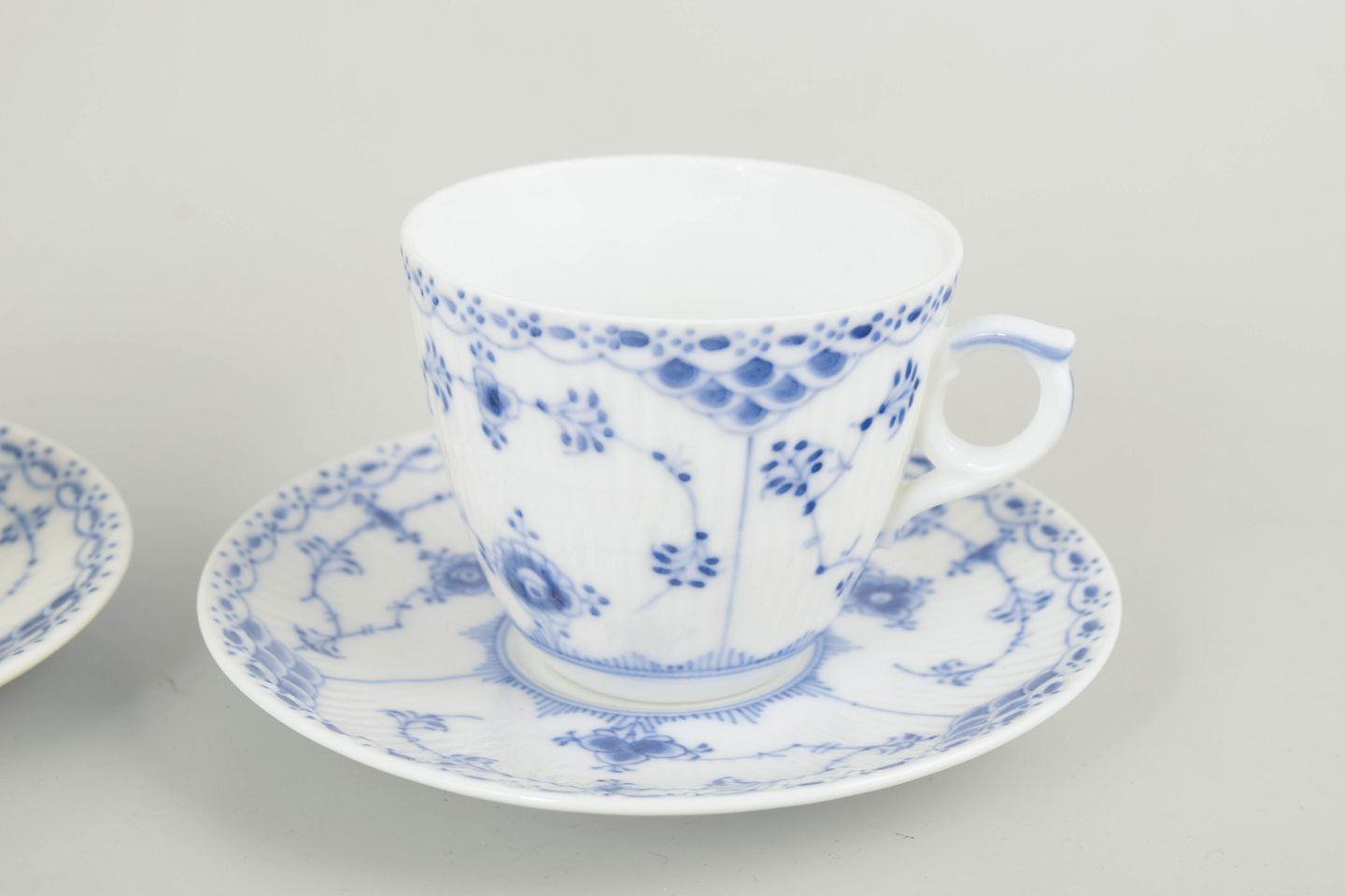 Sæt bestående af to kaffekopper med tilhørende underkopper i Musselmalet halvblonde. Klassiske riflede former med blondekant og håndmalet koboltblå dekoration. Et elegant kaffesæt fra mellemkrigstiden.