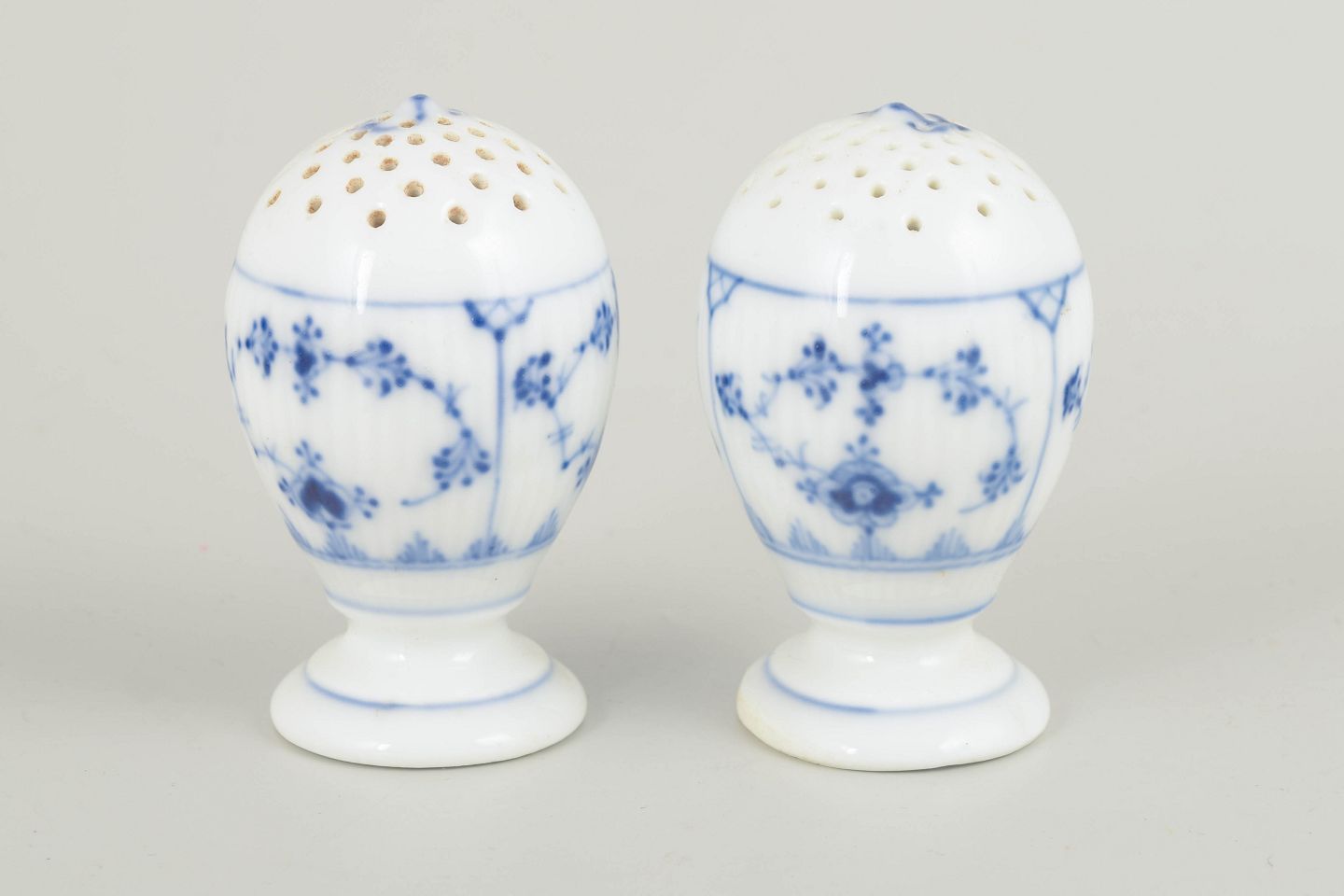 Antikt salt- og pebersæt i Musselmalet riflet, udført i klassisk riflet form og dekoreret med håndmalet koboltblå underglasur. De balusterformede beholdere med perforerede låg står på små fodstykker og fremstår som et elegant og funktionelt bordtilbehør fra århundredeskiftet, præget af håndværksmæssig kvalitet og tidløs formgivning.