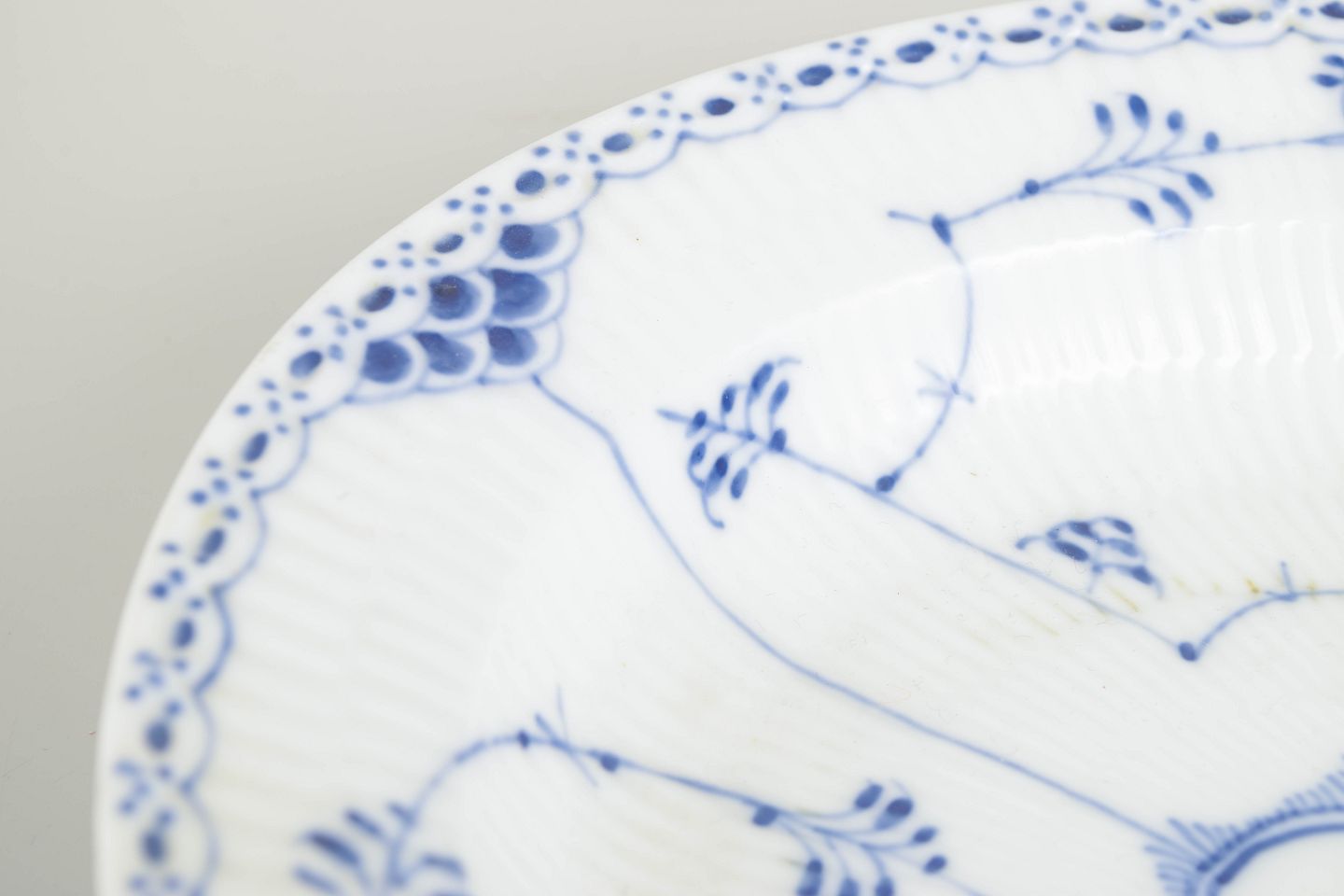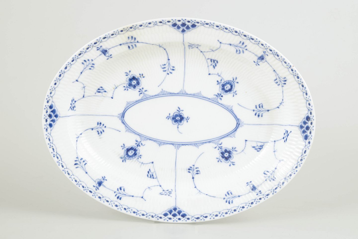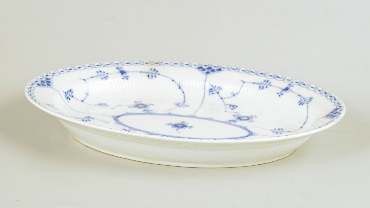 Ovalt fad i Musselmalet halvblonde med blondekant og håndmalet koboltblå dekoration.
