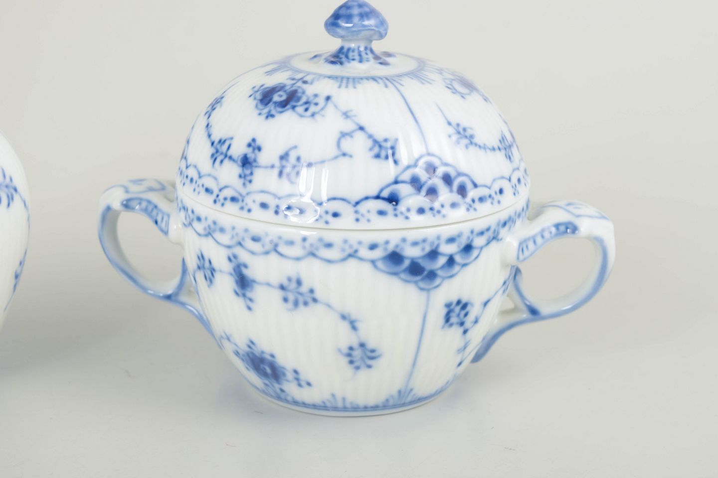 Sæt bestående af flødekande og sukkerskål i musselmalet halvblonde. Begge dele er udført i klassiske riflede former med gennembrudt blondekant og håndmalet koboltblå dekoration. Et harmonisk og elegant sæt til kaffe- og teservering.