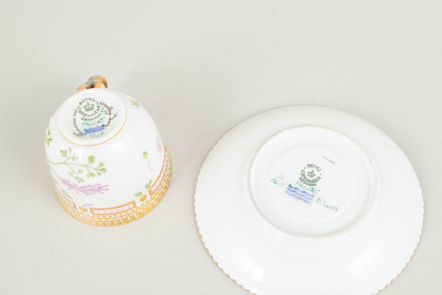 Elegant moccakop med tilhørende underkop i det ikoniske Flora Danica-stel. Koppen er håndmalet med botanisk motiv gengivet efter Flora Danica-værket og udført i stellets karakteristiske, raffinerede formsprog med dekorativ kant. En klassisk og eksklusiv kaffekop.