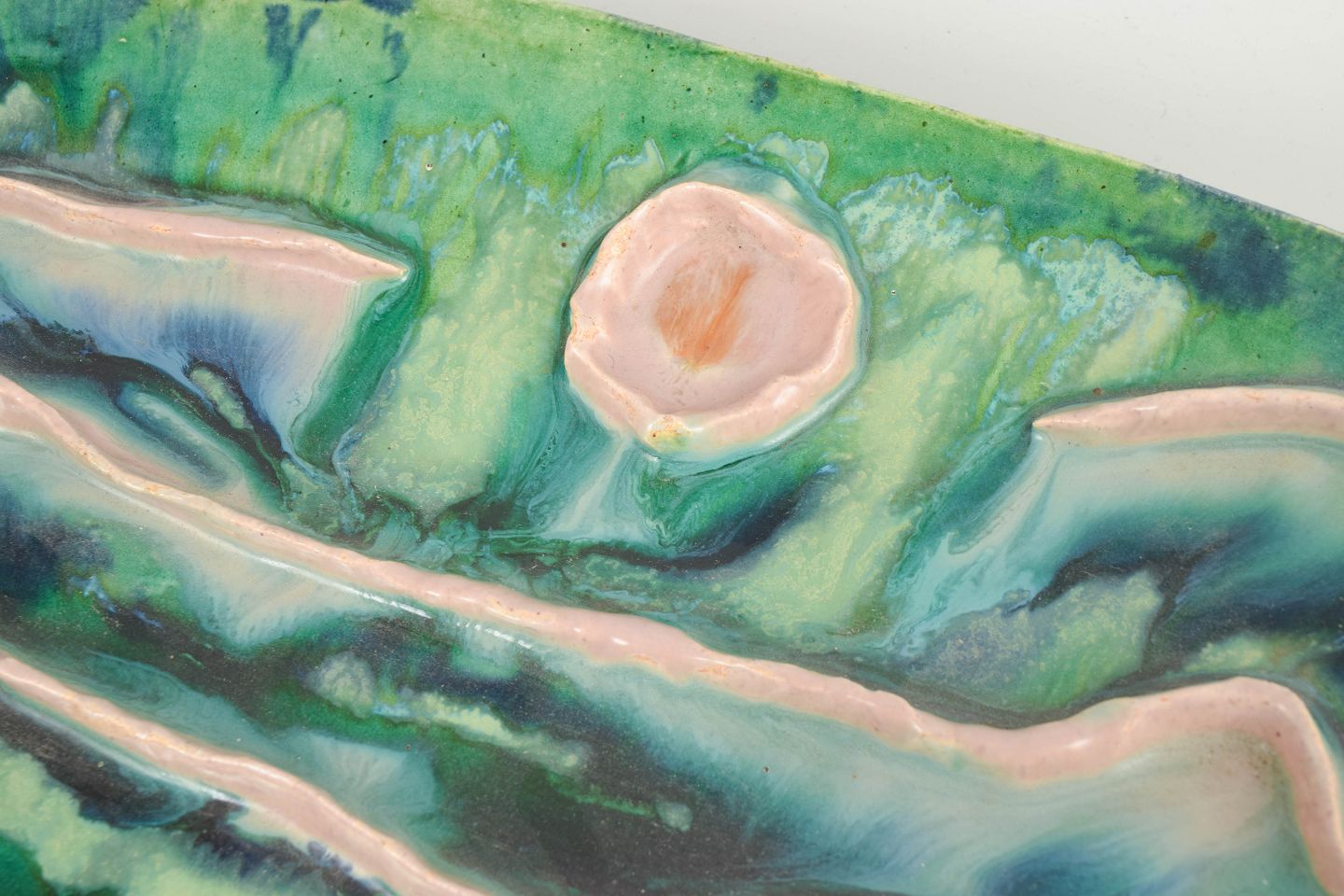Unikt, væghængt keramisk relief udført i organiske former med markant reliefvirkning. Overfladen er rigt modelleret med bølgende linjer og forhøjede partier, dekoreret med levende glasurer i grønne og blå nuancer, kontrasteret af bløde, lyserøde reliefelementer. Et ekspressivt og sanseligt værk, der tydeligt afspejler 1970’ernes eksperimenterende keramiske udtryk.