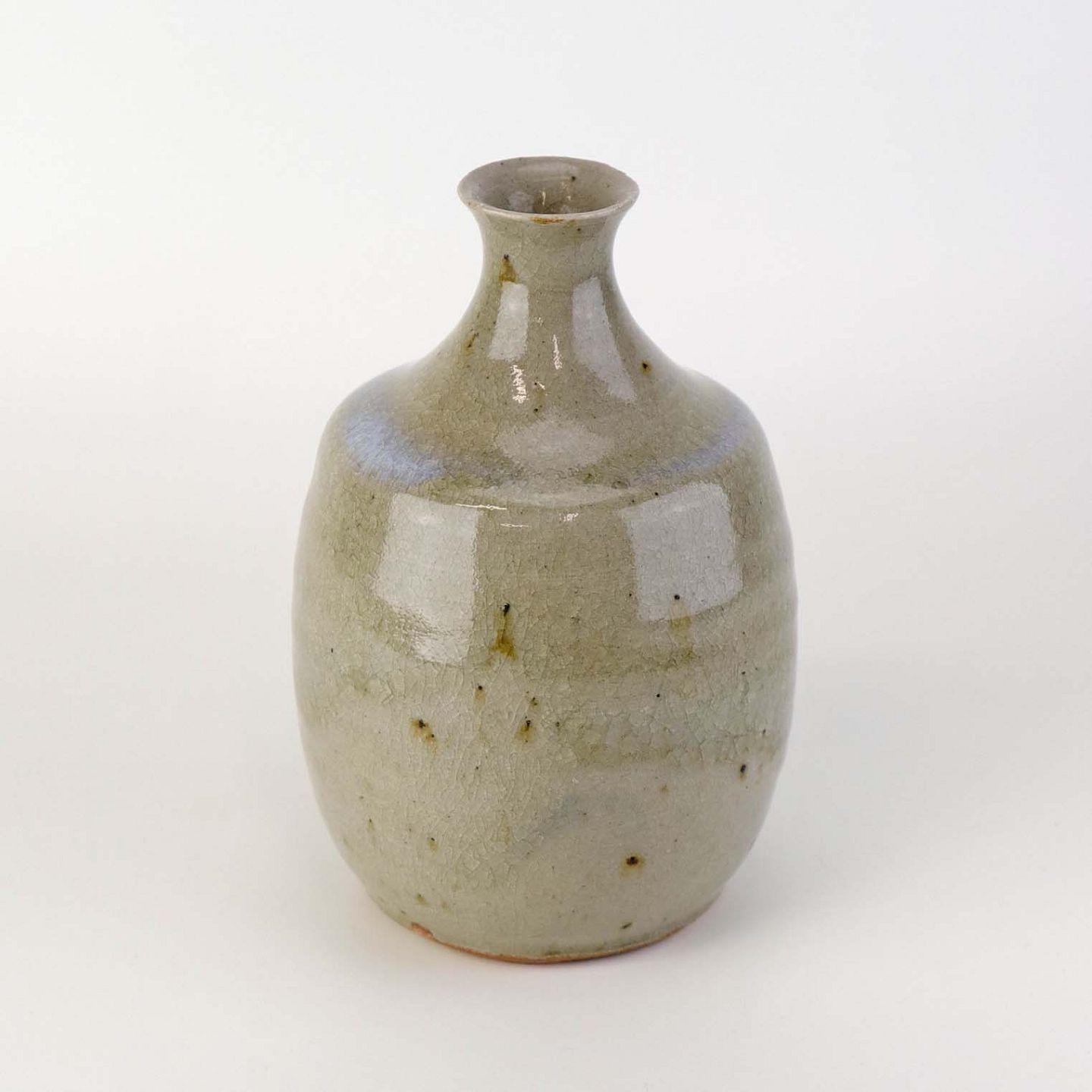 Vase i stentøj med beigefarvet glasur med mørke nister og krakkeleringer samt med en fremhævet blå kant.