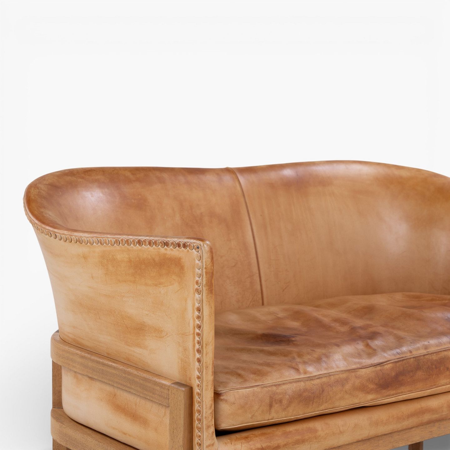 MK 52/2 - 2 pers. sofa i patineret sømbeslået naturlæder med stel i mahogni.