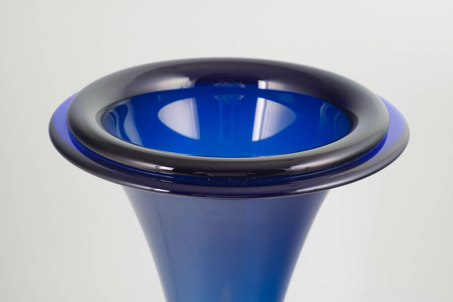 Monumental trompetformet vase i mundblæst, tungt krystalglas med dyb blå farvegraduering. En markant Art Deco-model med kraftig fod, slank stamme og bred, udadbøjet munding.