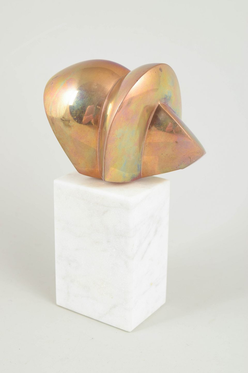 Abstrakt, organisk formet skulptur i massiv bronze med varm, nuanceret patina, monteret på rektangulær marmorsokkel. Skulpturen er signeret og nummereret 2/9.