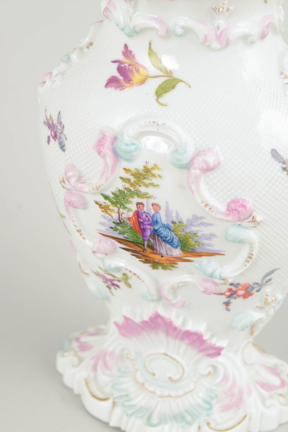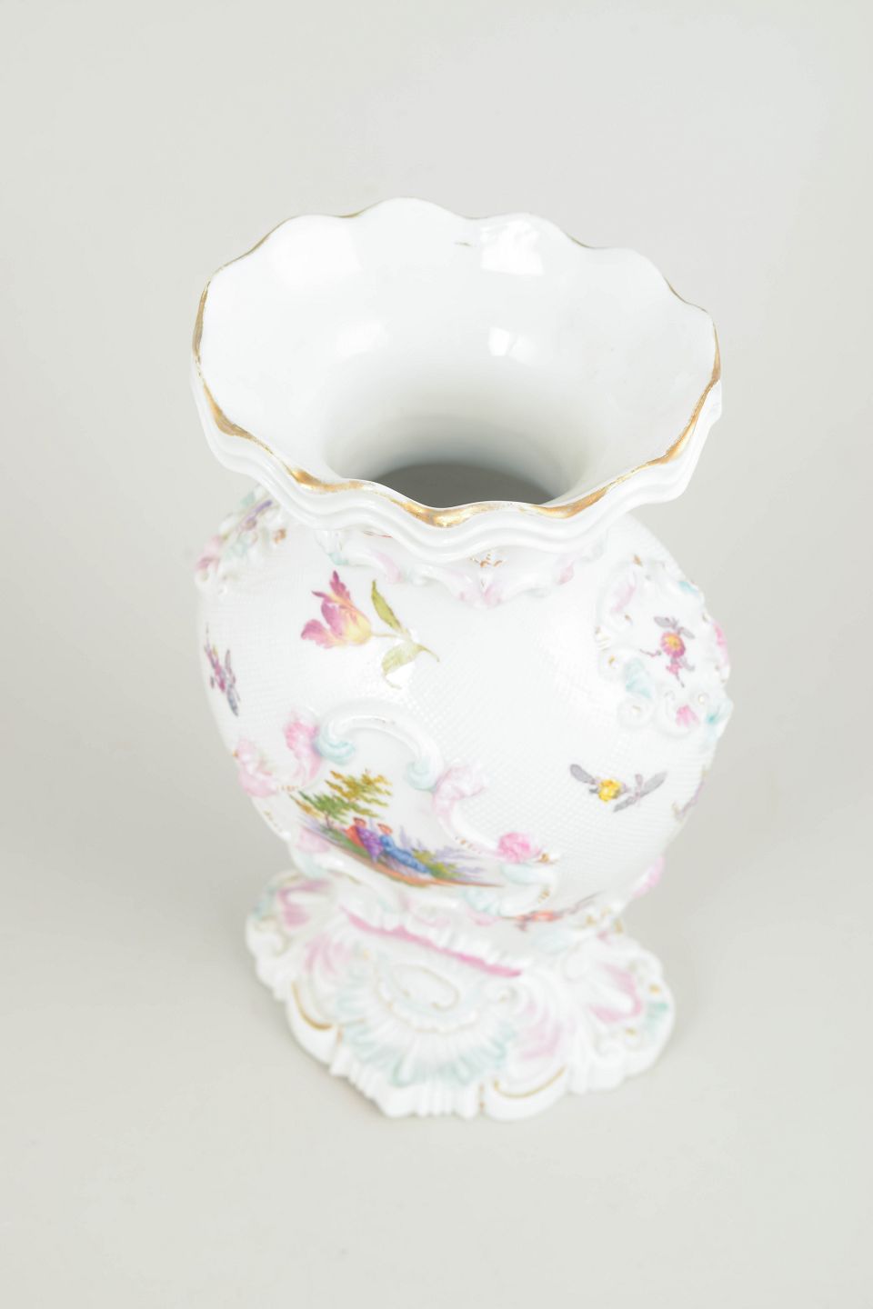 Sjælden vase i hvidt porcelæn rigt dekoreret i relief og med håndmalede polykrome blomster- og landskabsmotiver. Profileret fod og bølget munding. Et fint eksempel på Meissens dekorative porcelænskunst fra det tidlige 19. århundrede.