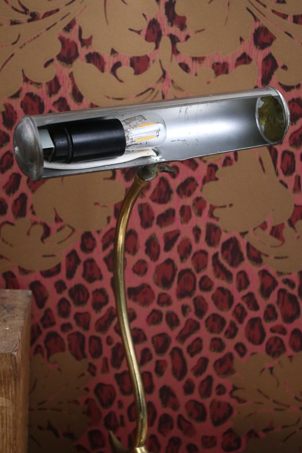 Gammel skrivebordslampe i patineret messing.