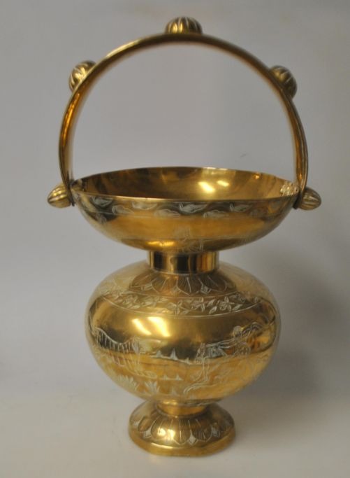 Stor indisk messing vase med hank, ca. 1950. Med indgraverede dekorationer af jagtselskab på elefanter på tiger jagt. På siden ses 4 tigre. Desuden indgraverede blomstermotiver. 32 cm. H.: 21 cm.
