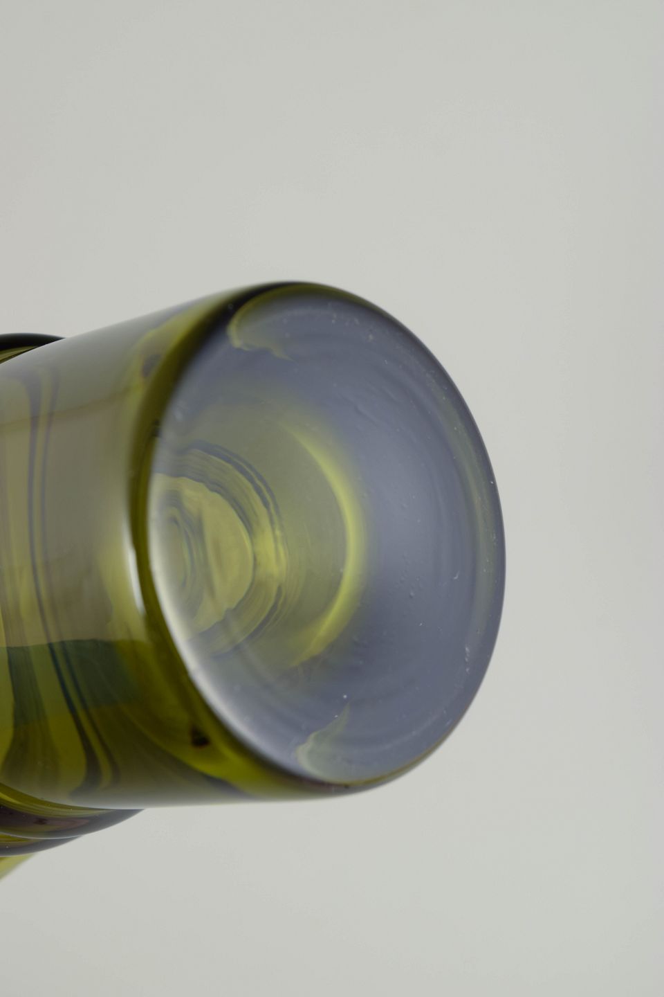 Elegant vase i olivengrønt glas med balanceret, skulpturel profil og blød, afrundet form. Mundblæst udførelse med markeret, ringformet midterparti og cylindrisk overdel, typisk for finsk kunstglas fra 1970’erne.