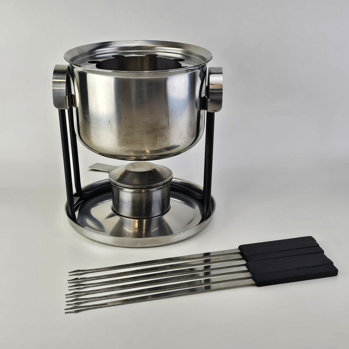 Stelton fonduesæt i rustfrit stål inklusiv stander, brænder, gryde og seks fondue gafler