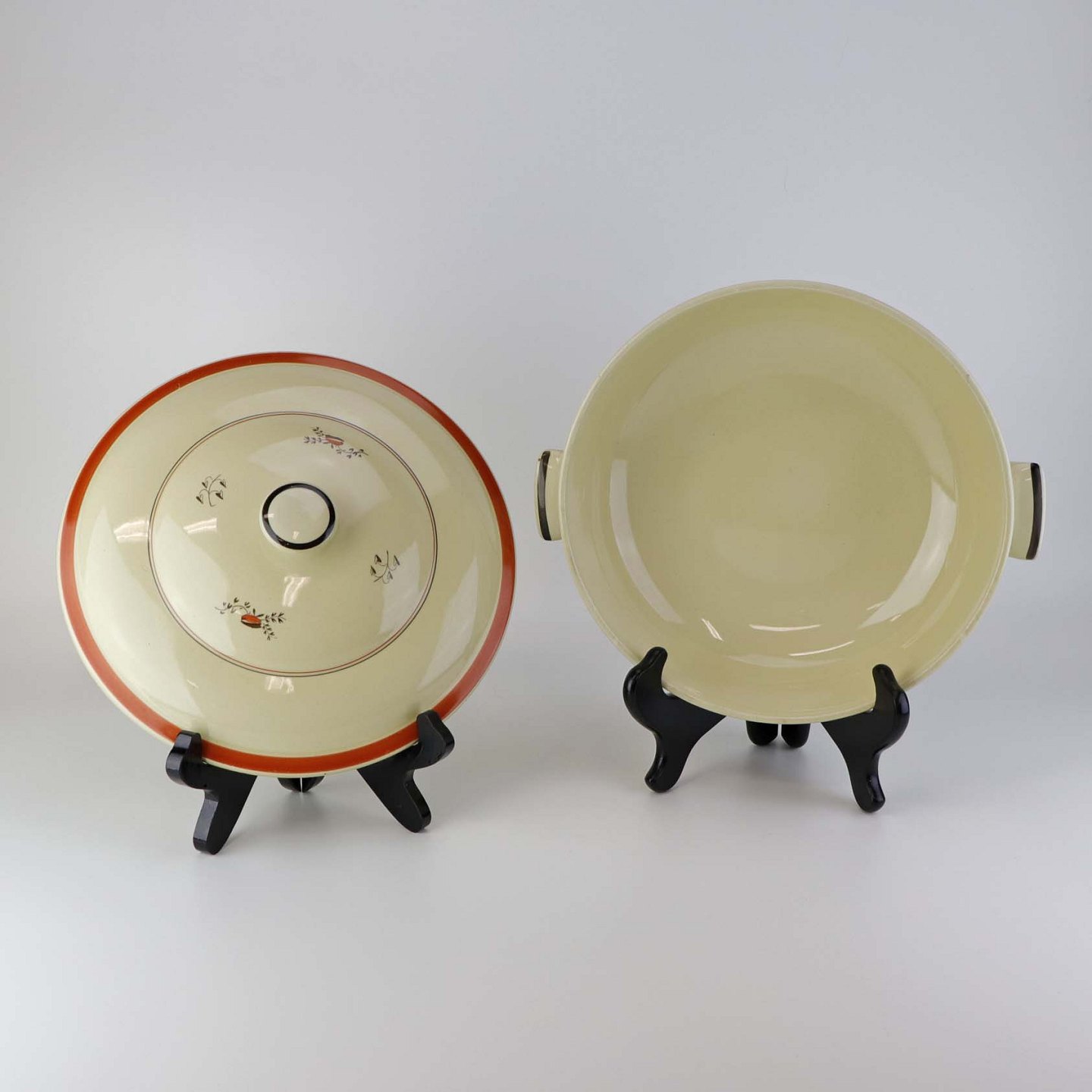 Fajancestel i stelform E med orangerød og brunt dekoration på gul baggrund og med orangerød kant.