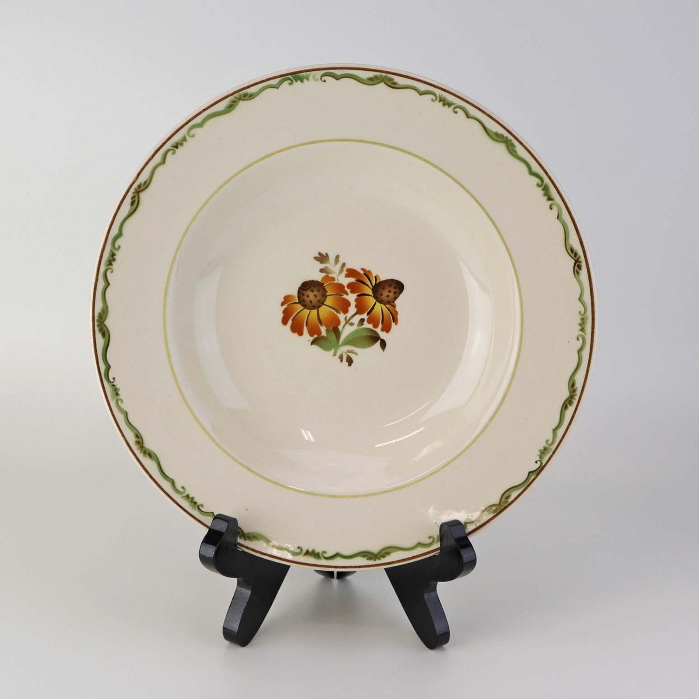 Fajancestel i stelform G med dekoration af orangegule blomster og grønne guirlander på lys baggrund med brun kant.