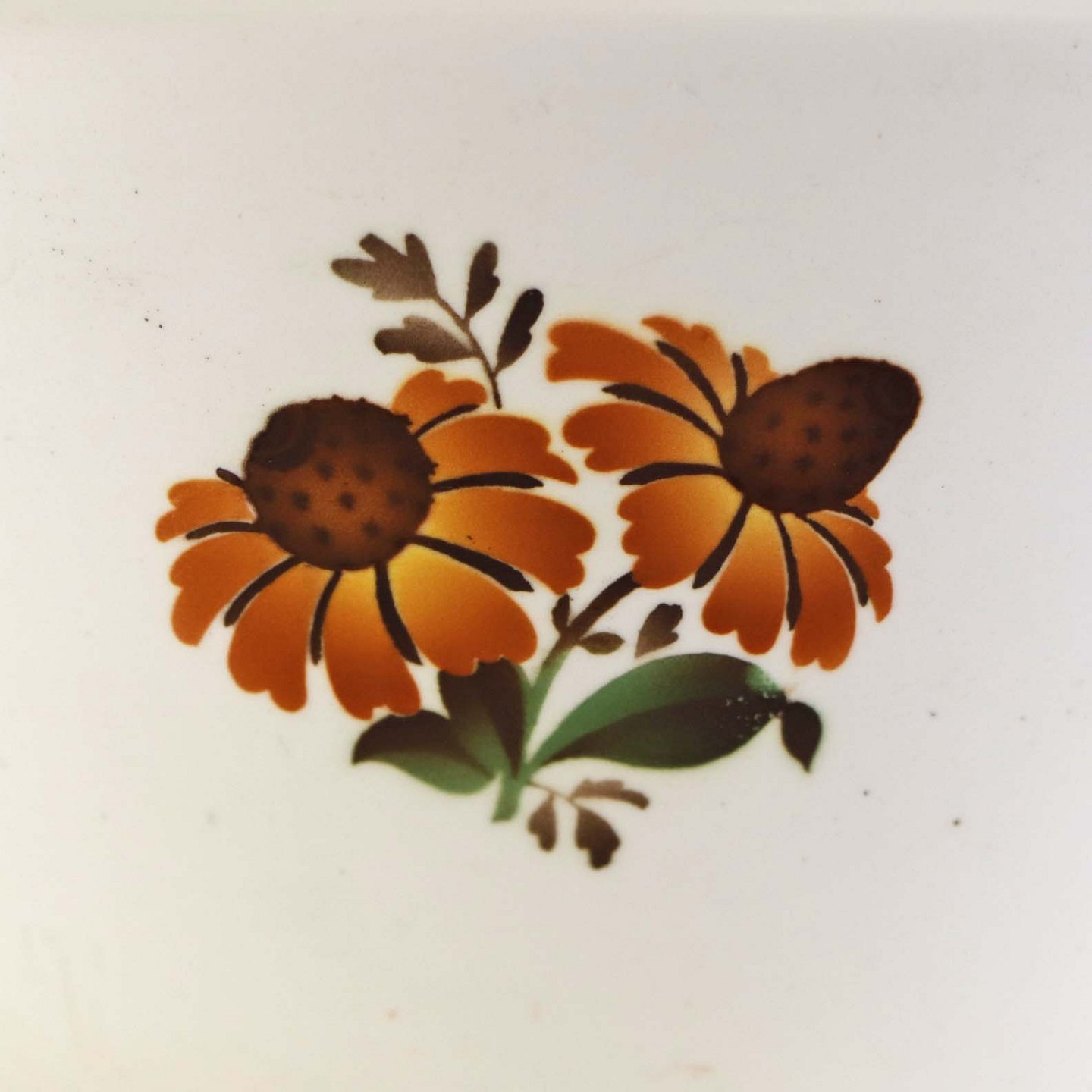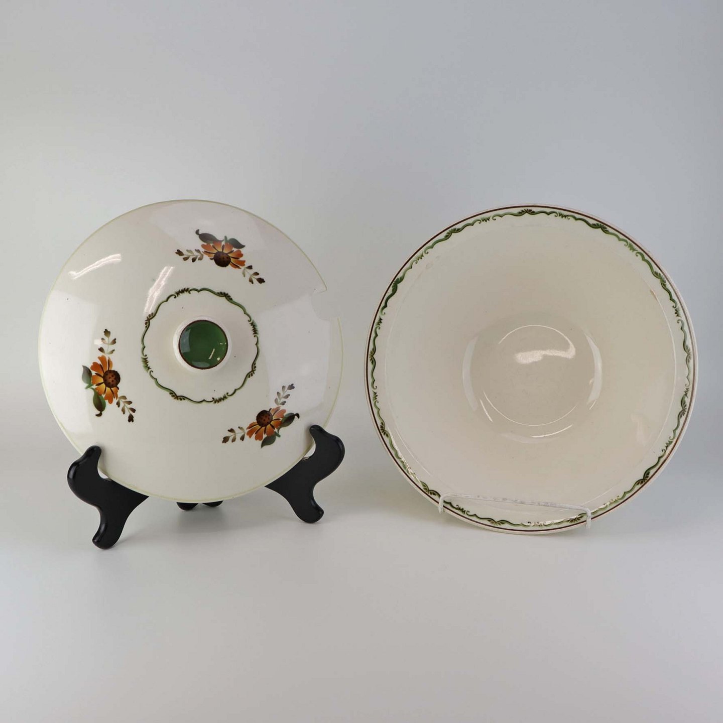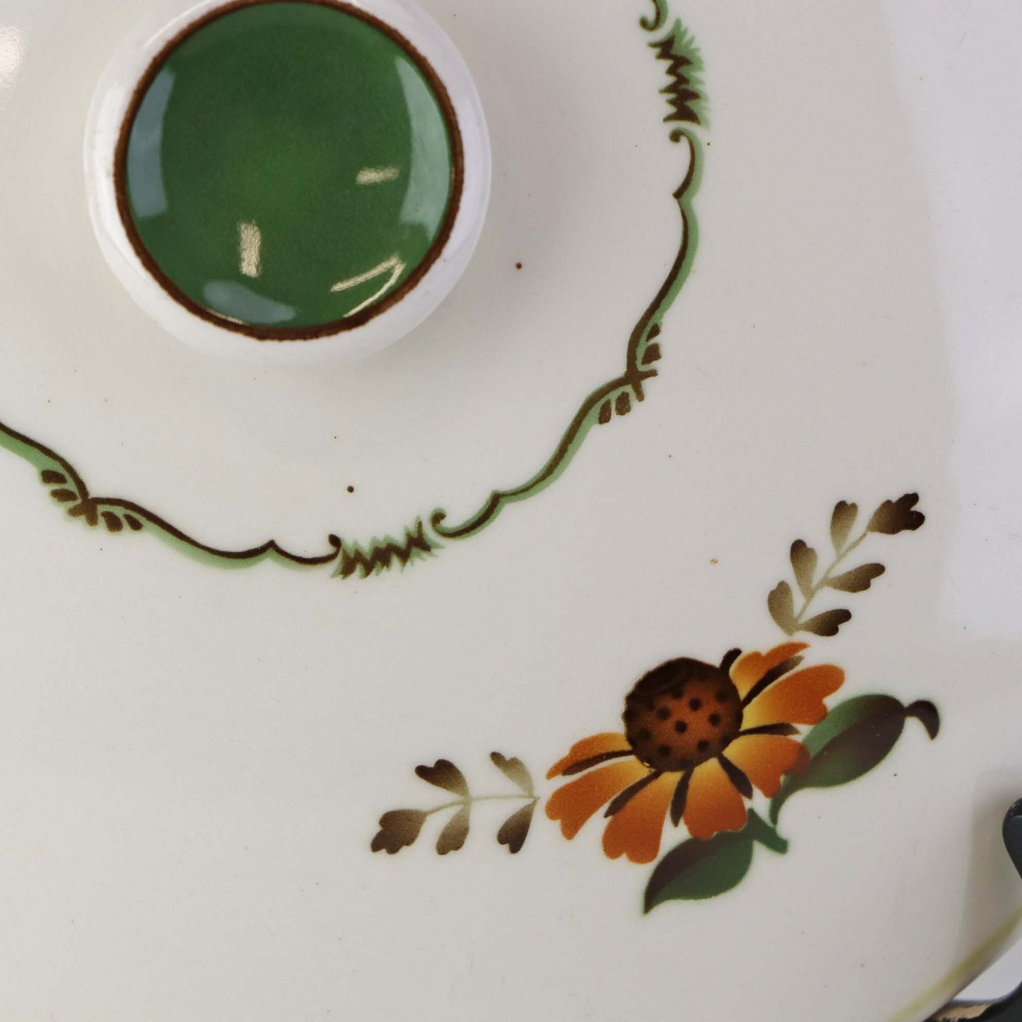 Fajancestel i stelform G med dekoration af orangegule blomster og grønne guirlander på lys baggrund med brun kant.
