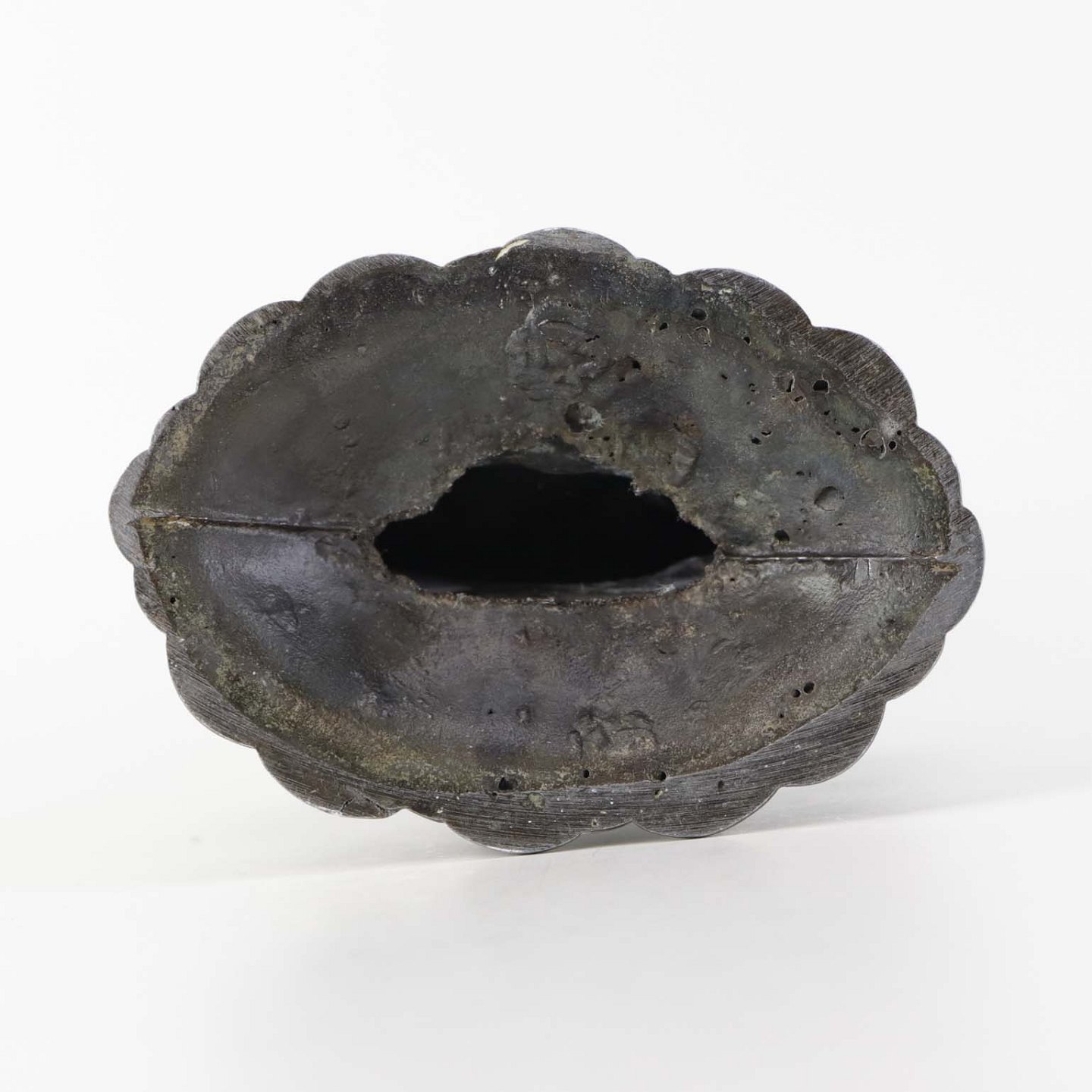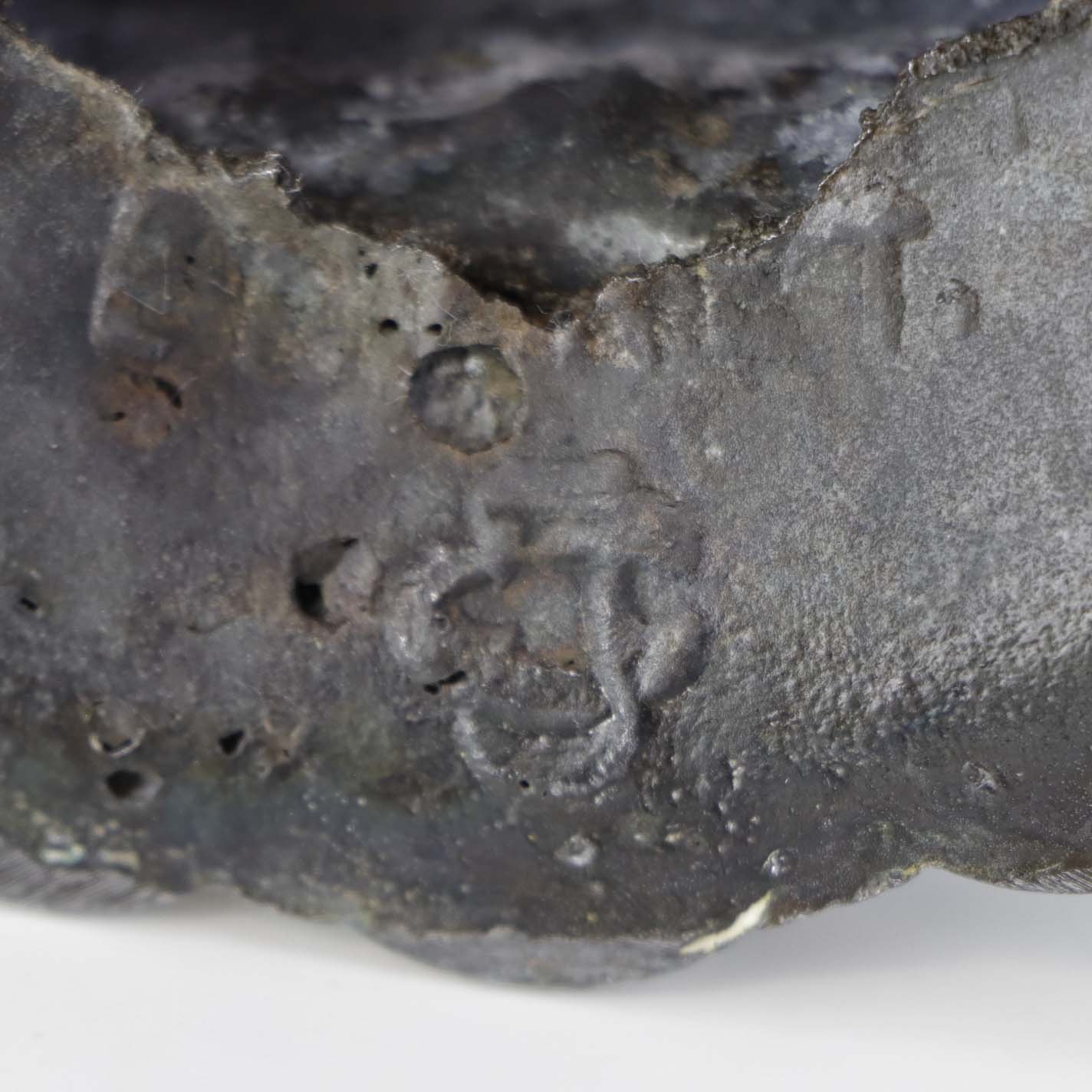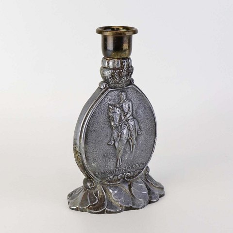Lysestage i tin med messing dekoration og top med motiv af Kong Christian den 10. til hest med teksten 'Der rider en konge' og '1870-1945'