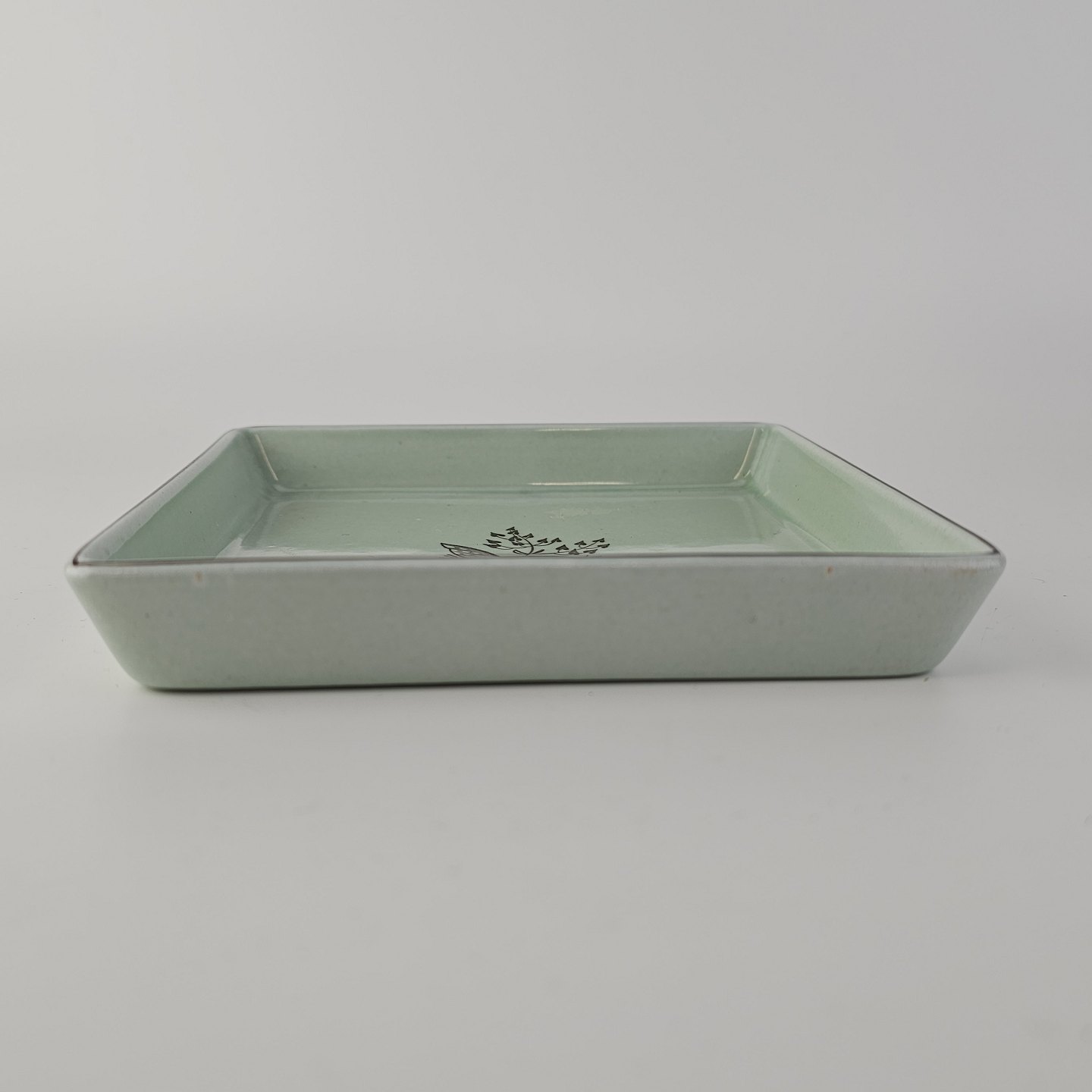 Stel i lysegrøn fajance med natur dekoration og flettet kant