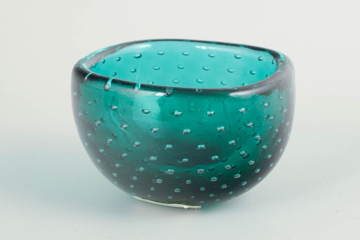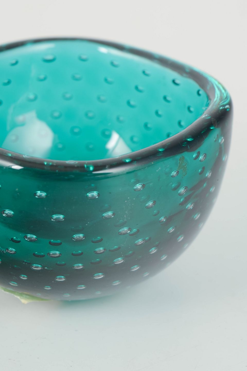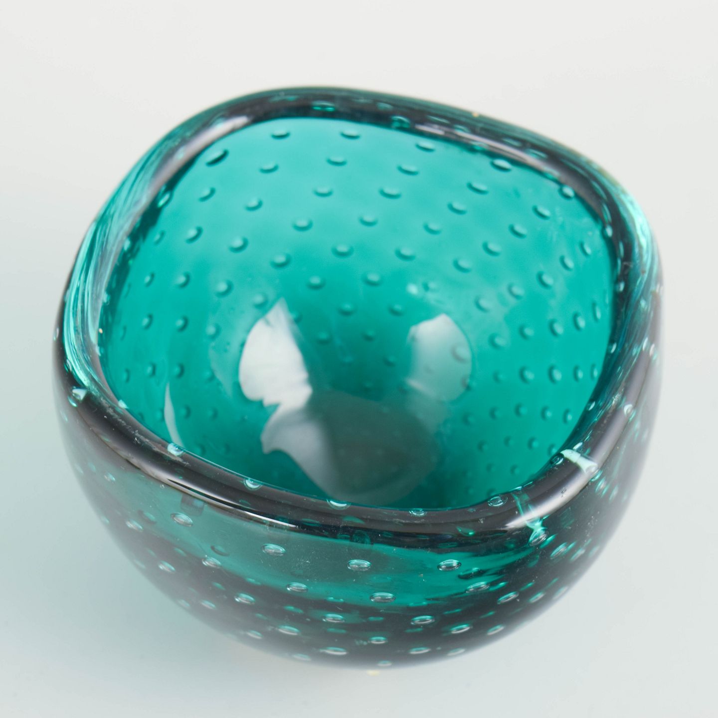 Rounded bowl in mouth-blown glass with a deep turquoise-green colour and evenly distributed air bubbles encased within the glass, executed using a classic Murano technique. The softly curved form and clear, transparent glass mass create a lively surface interplay and an elegant, period-specific expression. Produced by Venini in Murano during the 1960s/70s.