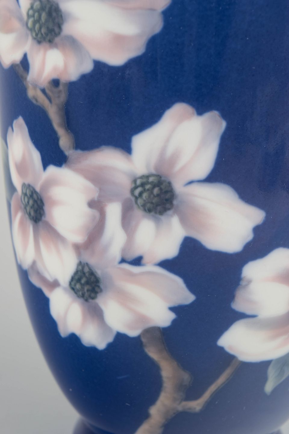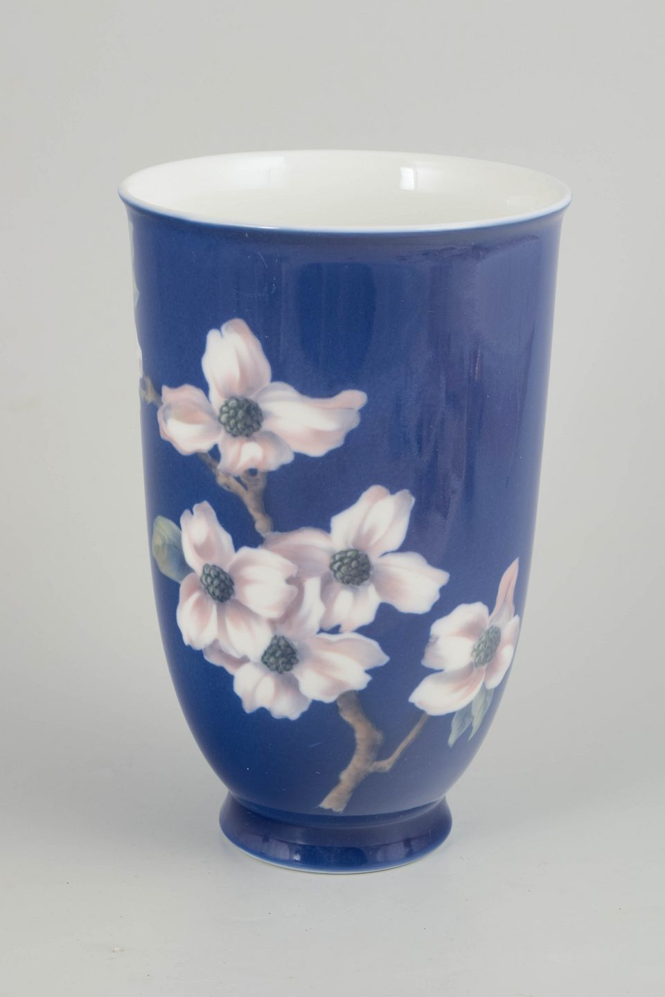 Høj, cylindrisk vase i glaseret porcelæn med dyb koboltblå bund og håndmalet underglasurdekoration af blomster i lyse rosa og hvide nuancer med fine grå detaljer. Den kontrastfulde dekoration fremhæver vasens enkle, oprette form og giver et klart, elegant udtryk.