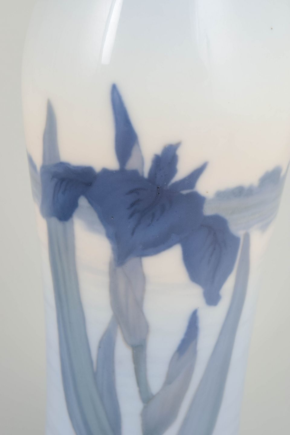 Høj, let facetteret vase i glaseret porcelæn med håndmalet underglasurdekoration af irisblomster i dybe blå nuancer med grønne stilke, udført mod en lys, let tonet bund. Dekorationen er elegant strakt langs vasens lodrette form og afspejler Royal Copenhagens naturalistiske formsprog i 1920’erne.