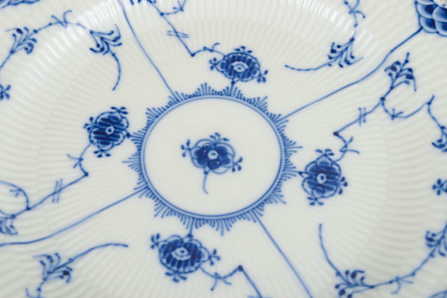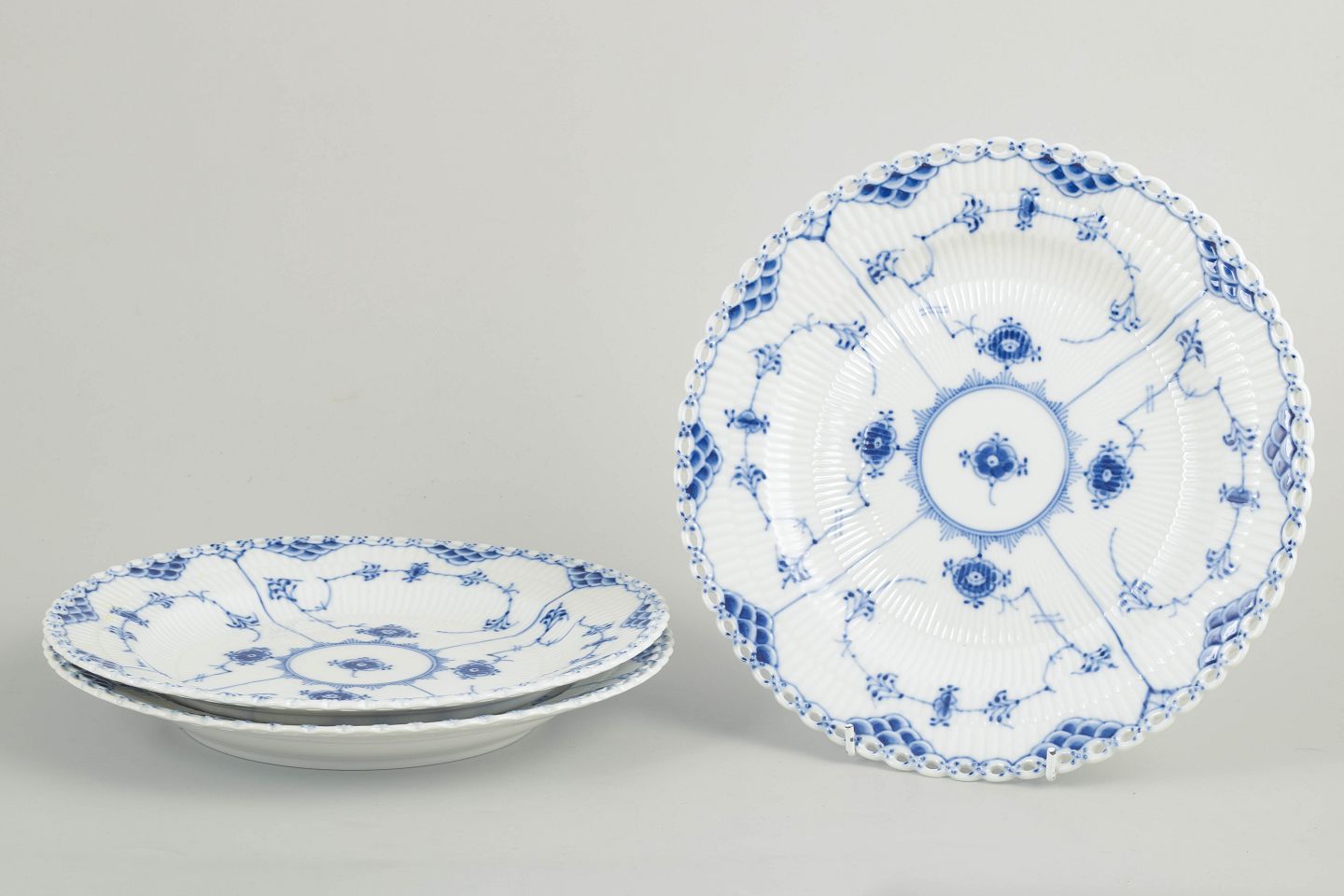 Sæt bestående af tre tallerkener i glaseret porcelæn med håndmalet underglasurdekoration i det klassiske musselmalede helblonde mønster, kendetegnet ved den gennembrudte blondekant.