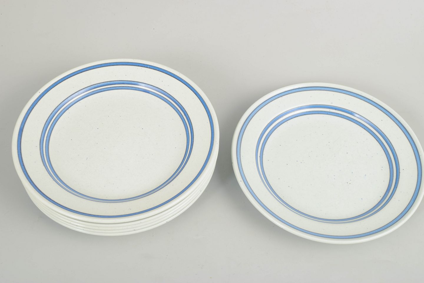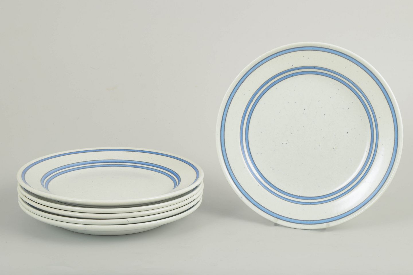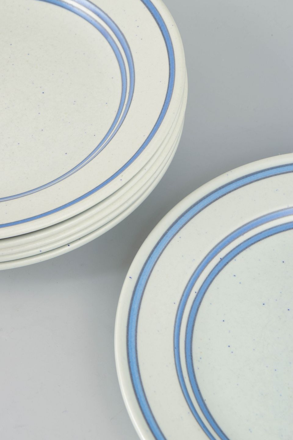 Sæt af tallerkener i fajance med enkel, rund form og diskret dekoration i blå linjer på lys bund. Tallerkenerne er udført i Gustavsbergs “Dart”-serie, kendetegnet ved sit stringente og grafiske udtryk, som er typisk for Stig Lindbergs produktion i perioden.