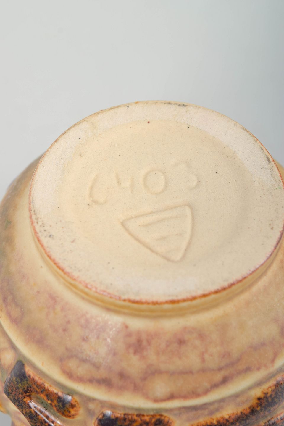 Kompakt, rund vase i glaseret stentøj med plastisk reliefdekoration af dyr og stiliserede bladmotiver. Udført i varme, jordnære glasurtoner med kontrast mellem lys bund og mørkere, let krakeleret relief, karakteristisk for Michael Andersen & Søns produktion på Bornholm i perioden. Modellen er en del af værkstedets figurative og dekorative linje fra tiden.