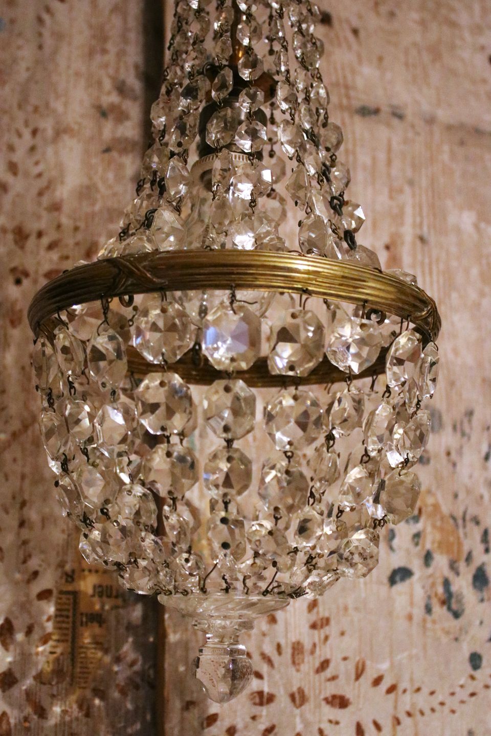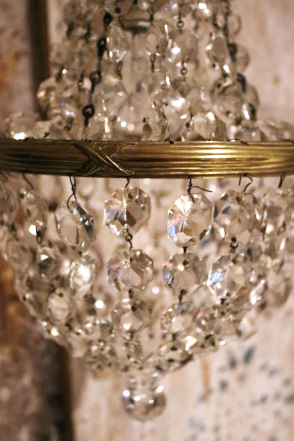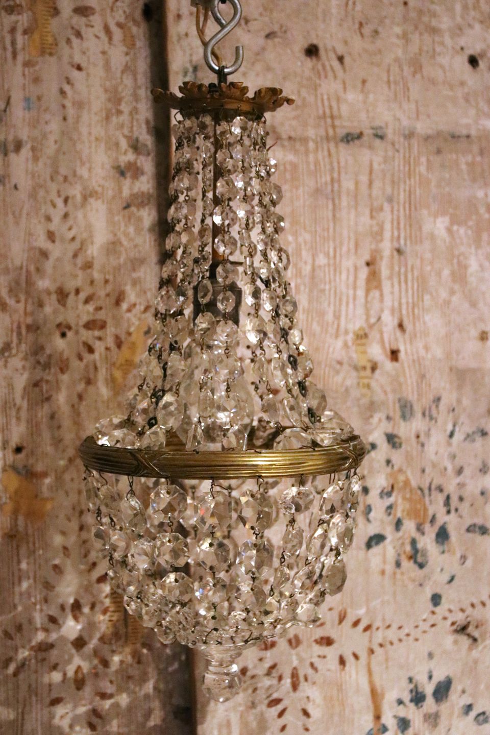 Old, mini prism chandelier in bronze with clear cut glass prisms...