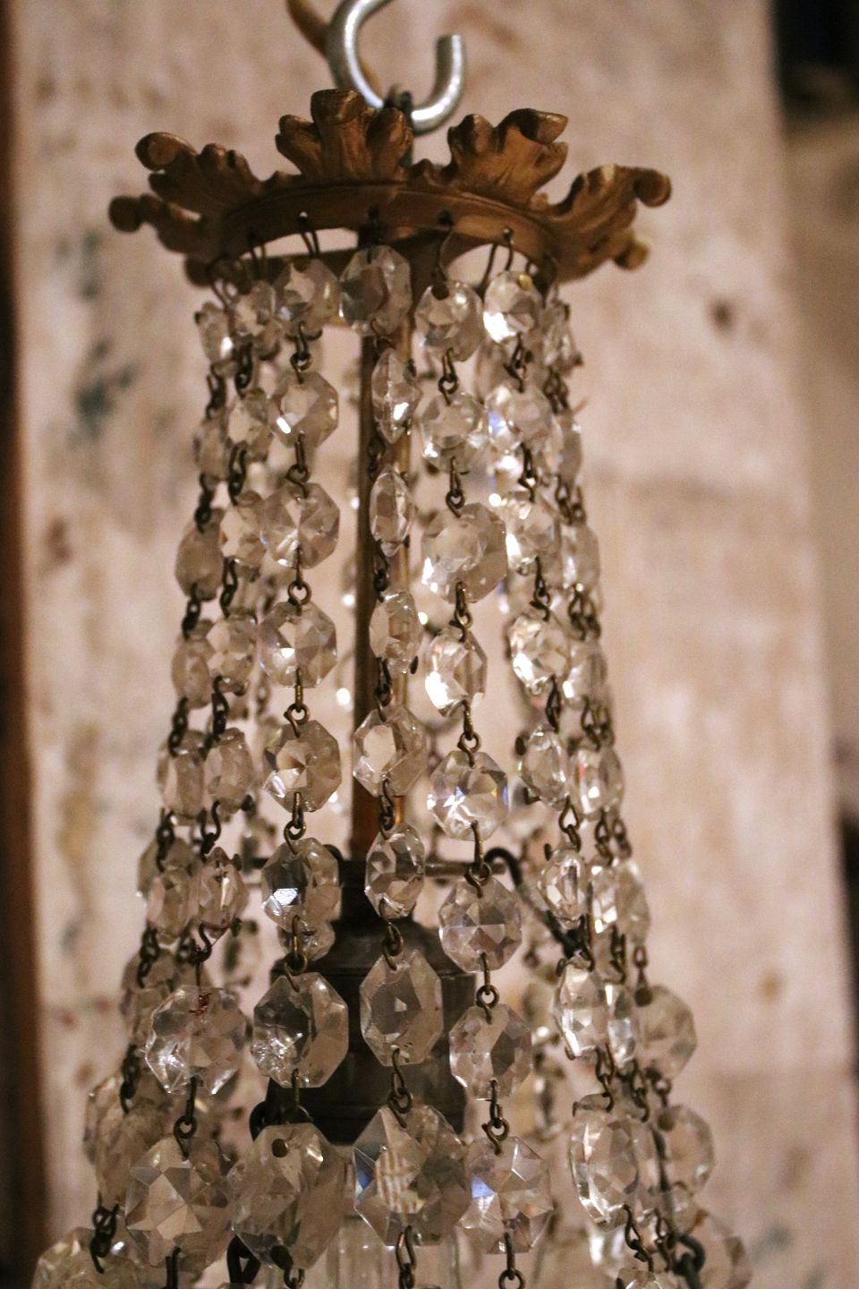 We offer a wide selection of old furniture with character, prism chandeliers and French church candlesticks.