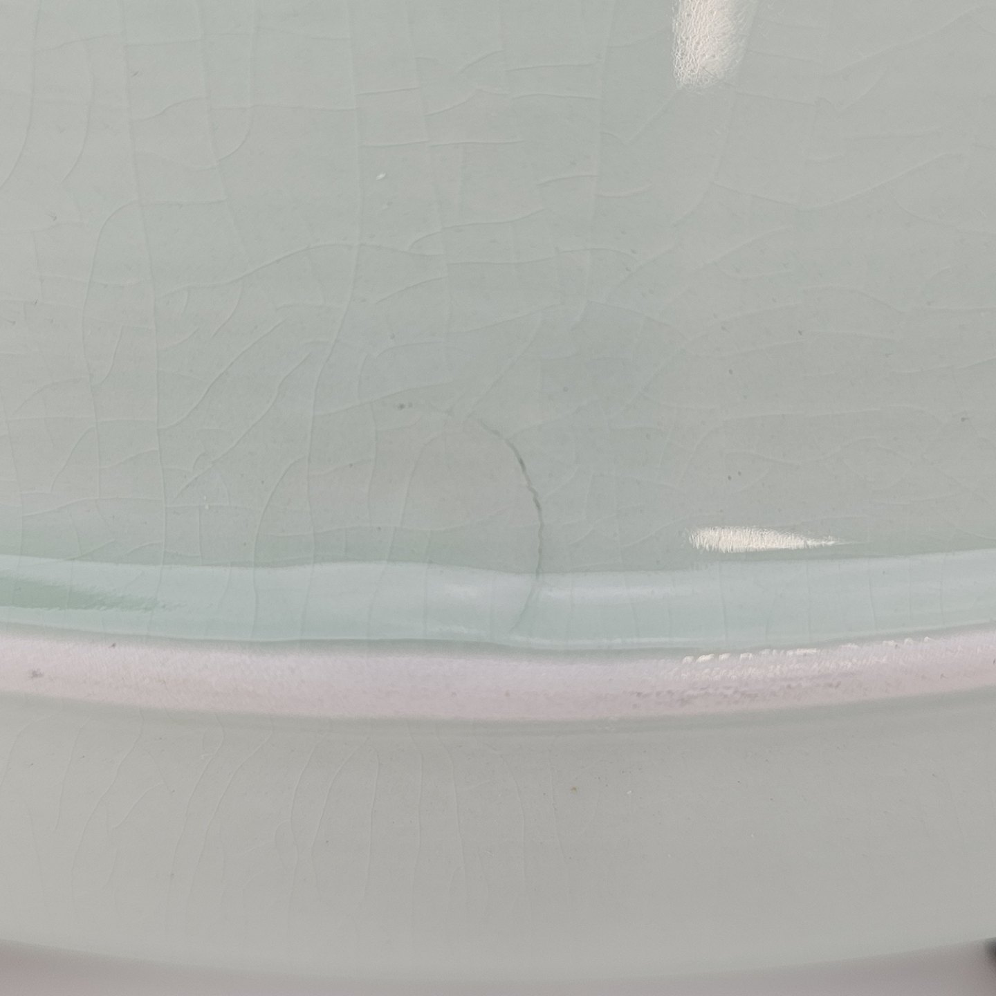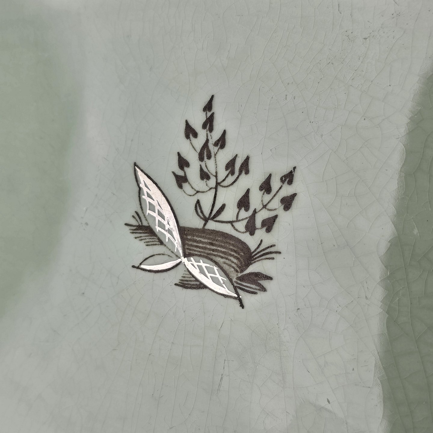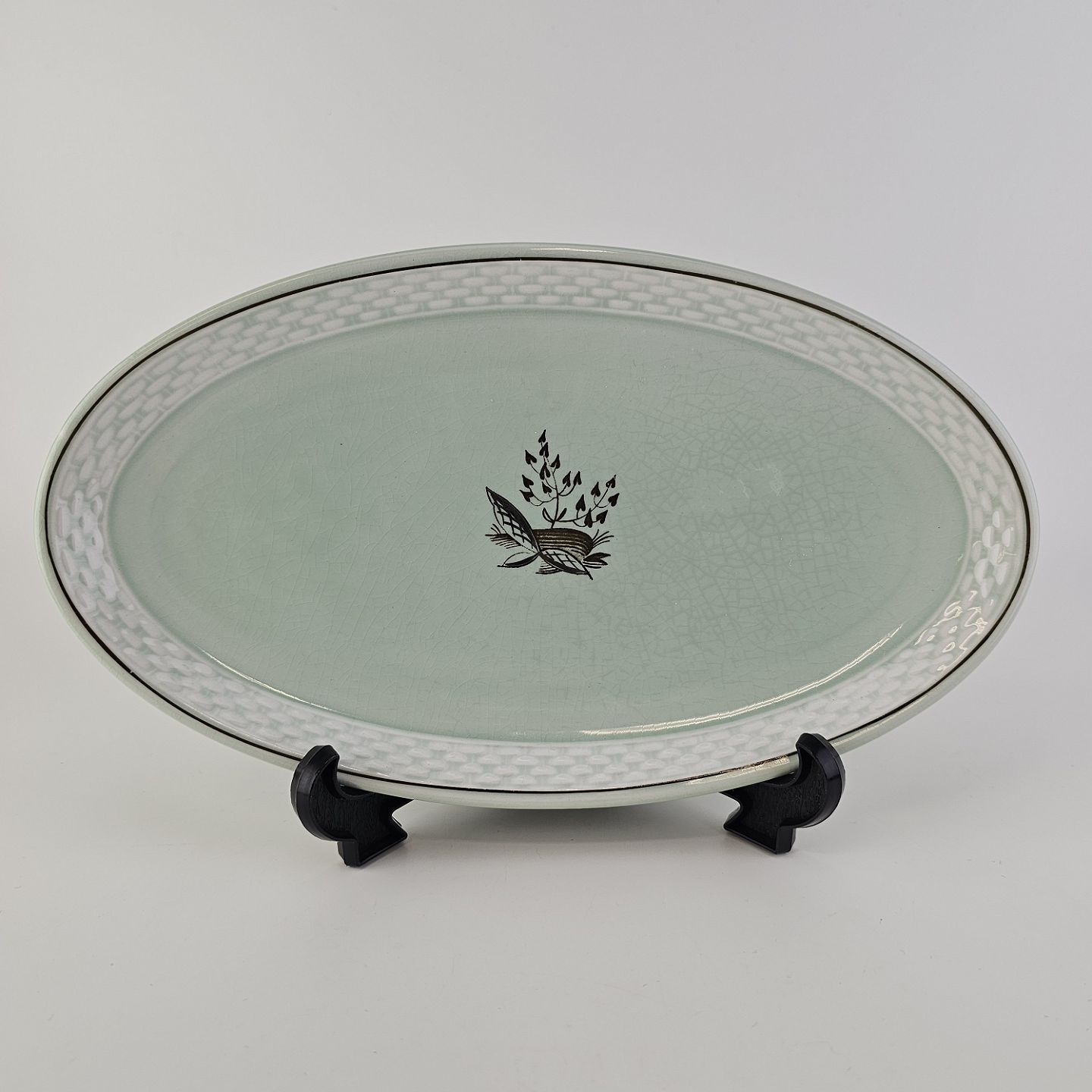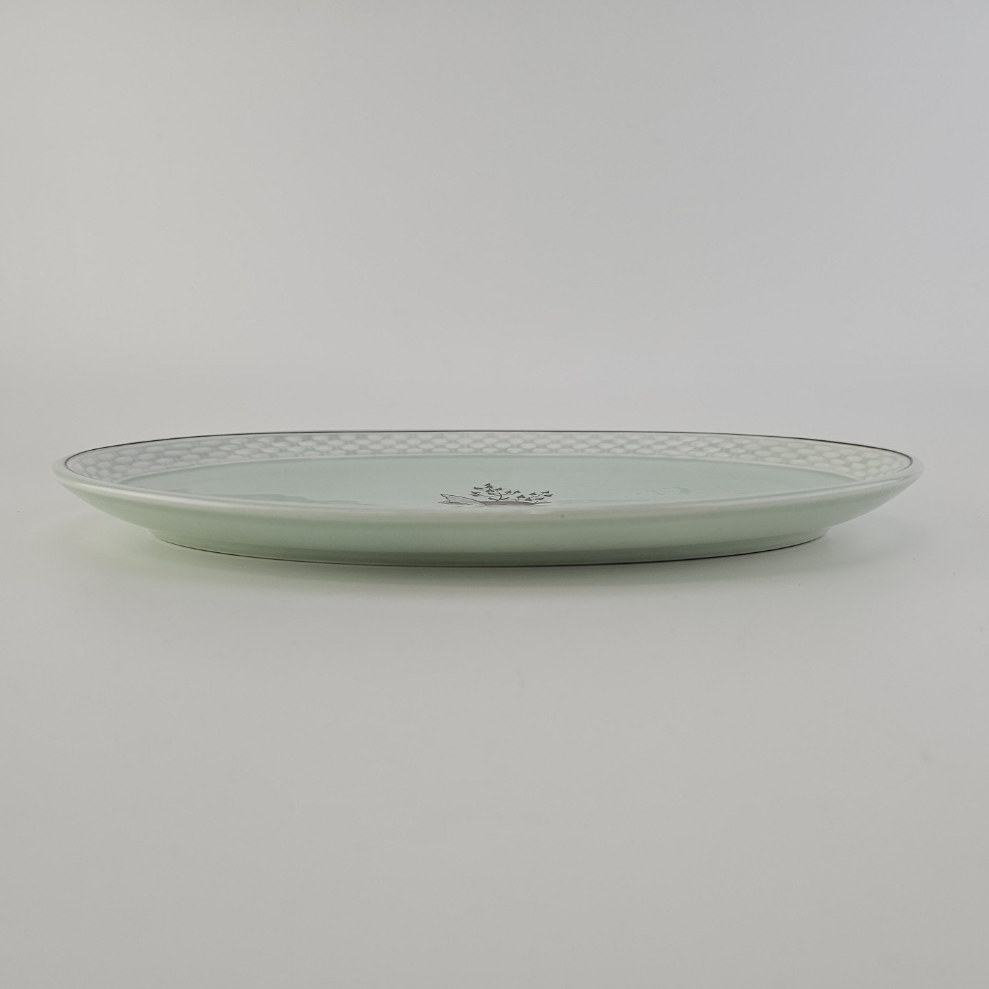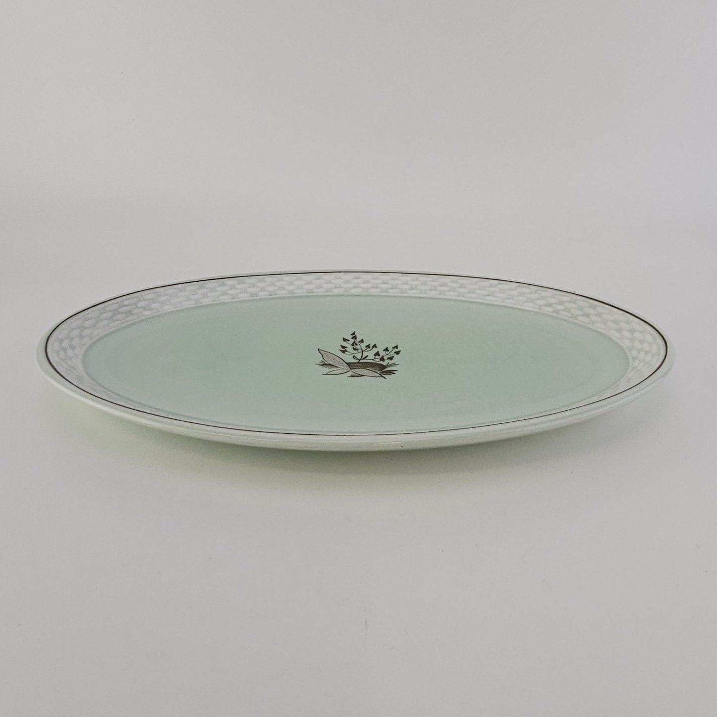 Stel i lysegrøn fajance med natur dekoration og flettet kant
