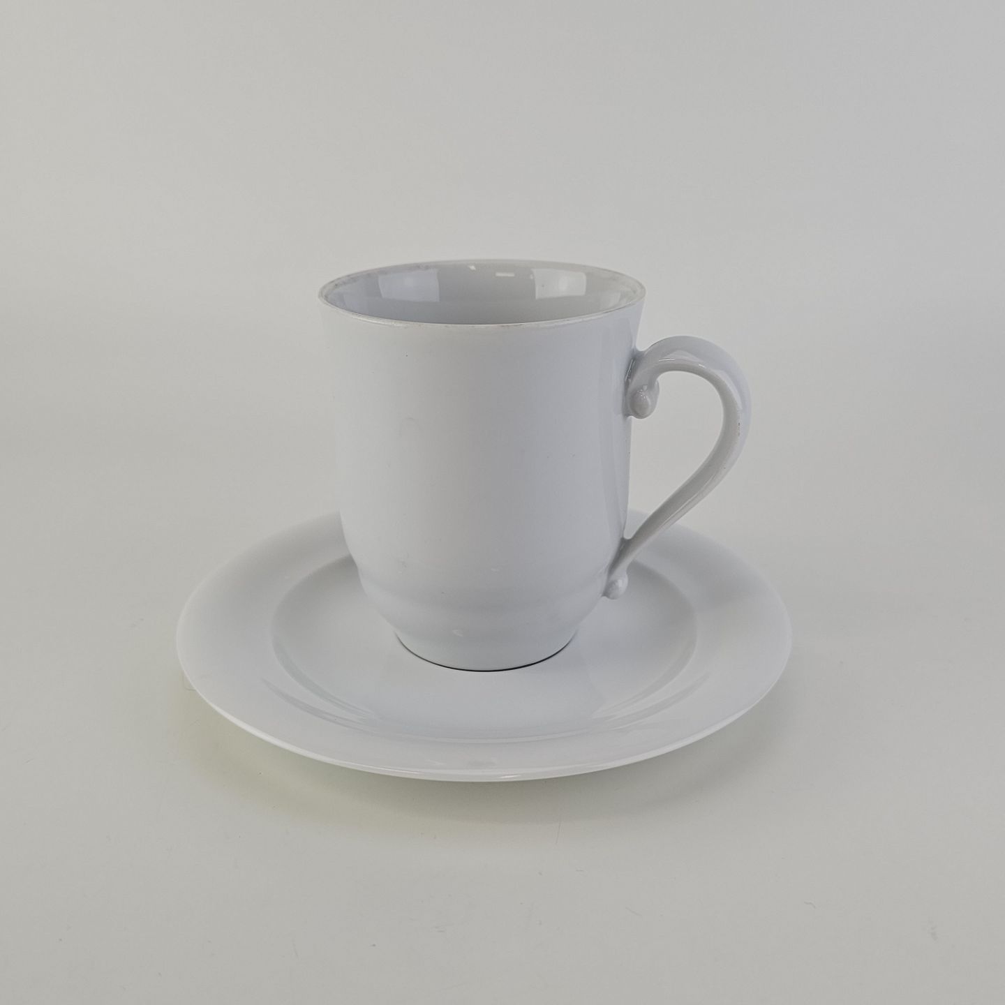 Høj kop med underkop i hvidt kongeligt porcelæn