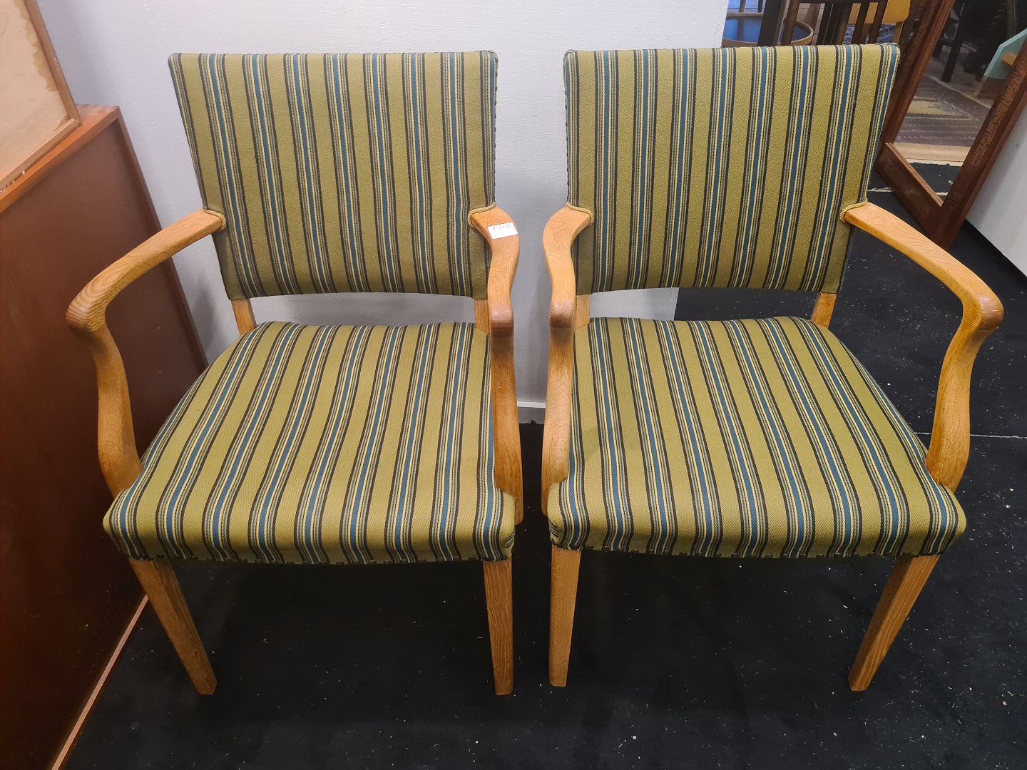 Par Dansk Design armstole fra 1950'erne. Fremstillet i eg og betrukket med stof fra 1970'erne. Fremstår gode og stabile uden nævneværdige brugsspor.