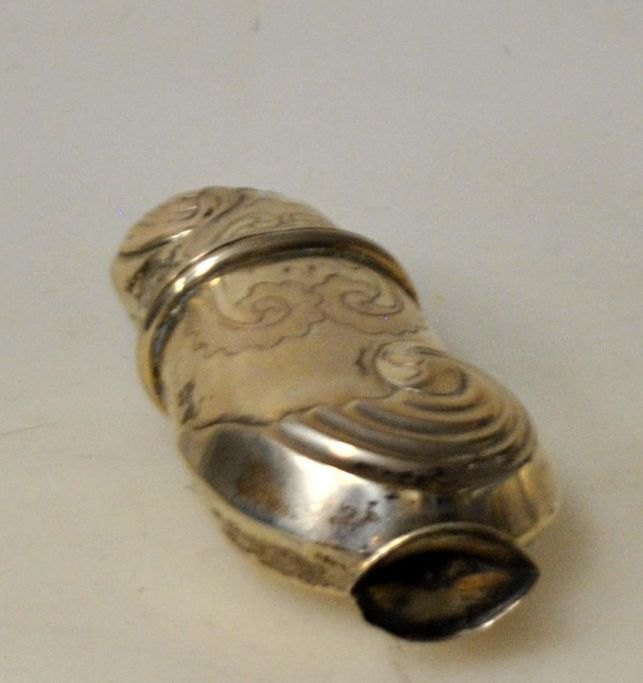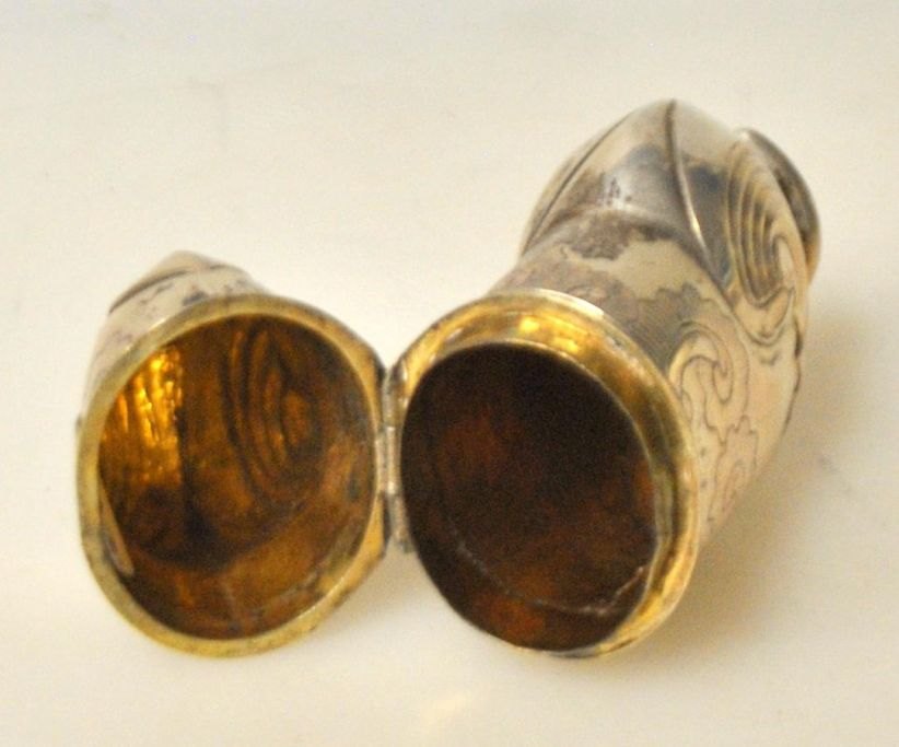 Rococo vinagrette egg in silver, 18th century. Denmark. With external rococo decorations. Internally gilded. Unmarked. H.: 7.5 cm. On a newer oval foot.