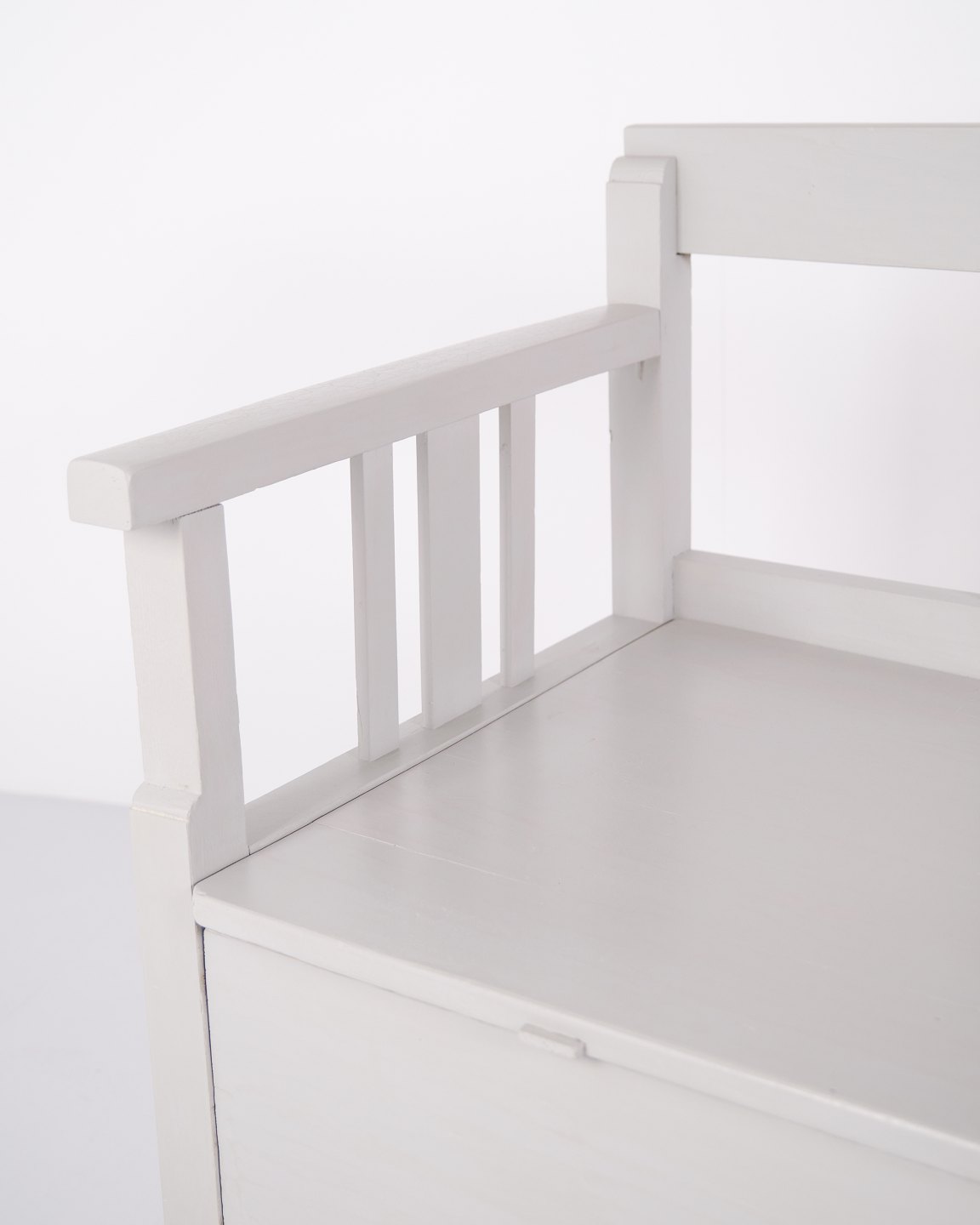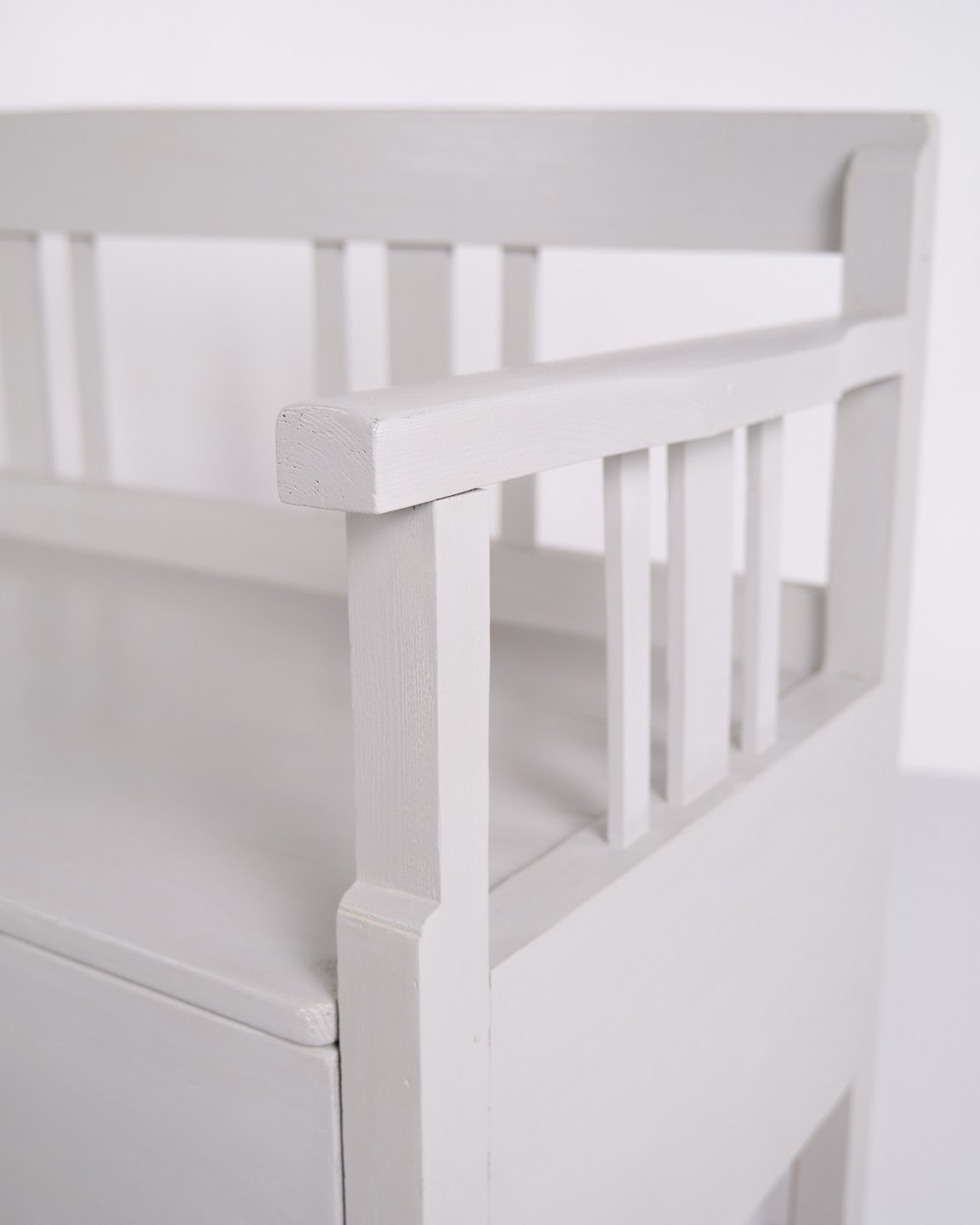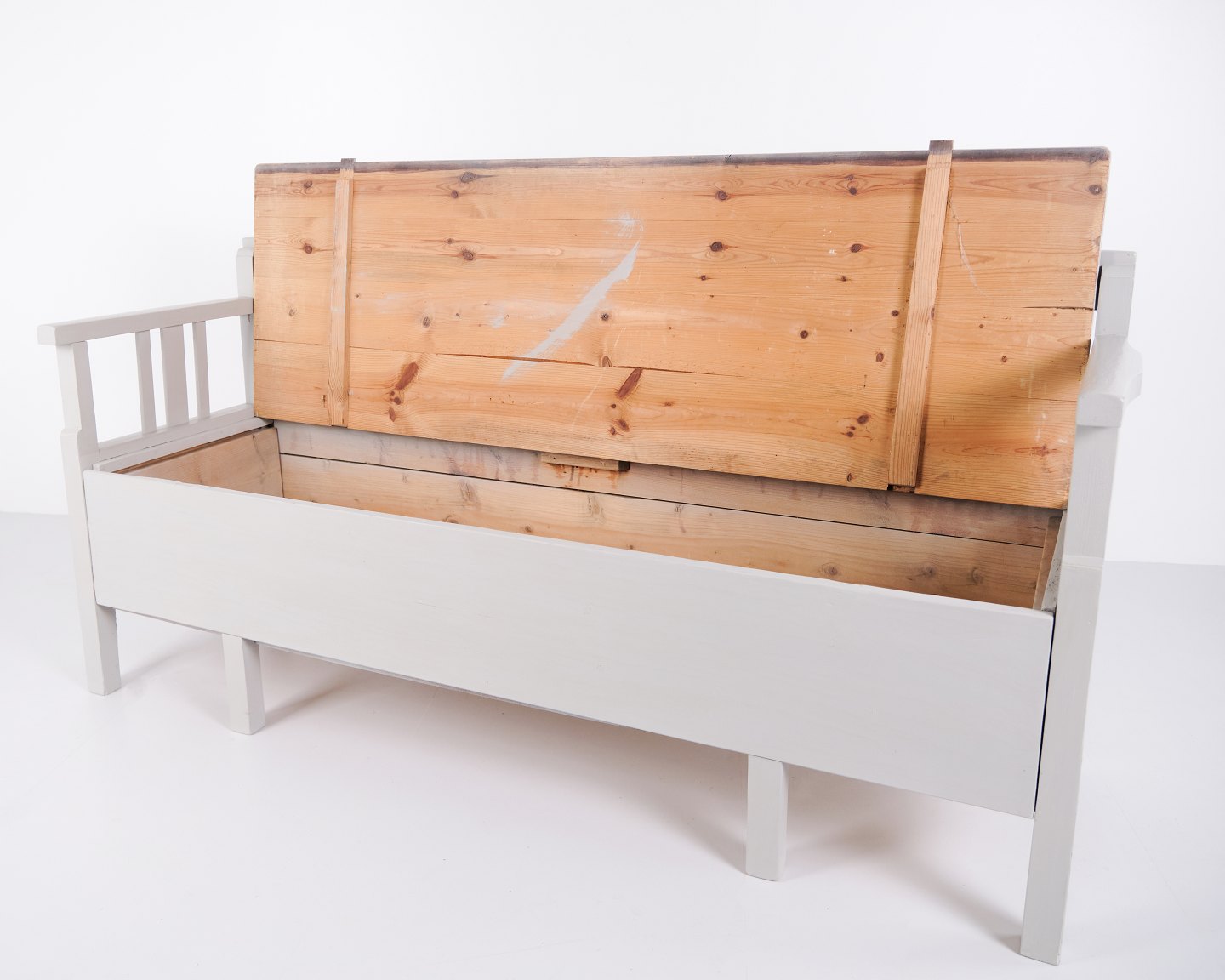 Antik slagbænk 1860’erne i gråmalet fyrretræ med opbevaring. Antik opbevaringsbænk 1800-tallet.