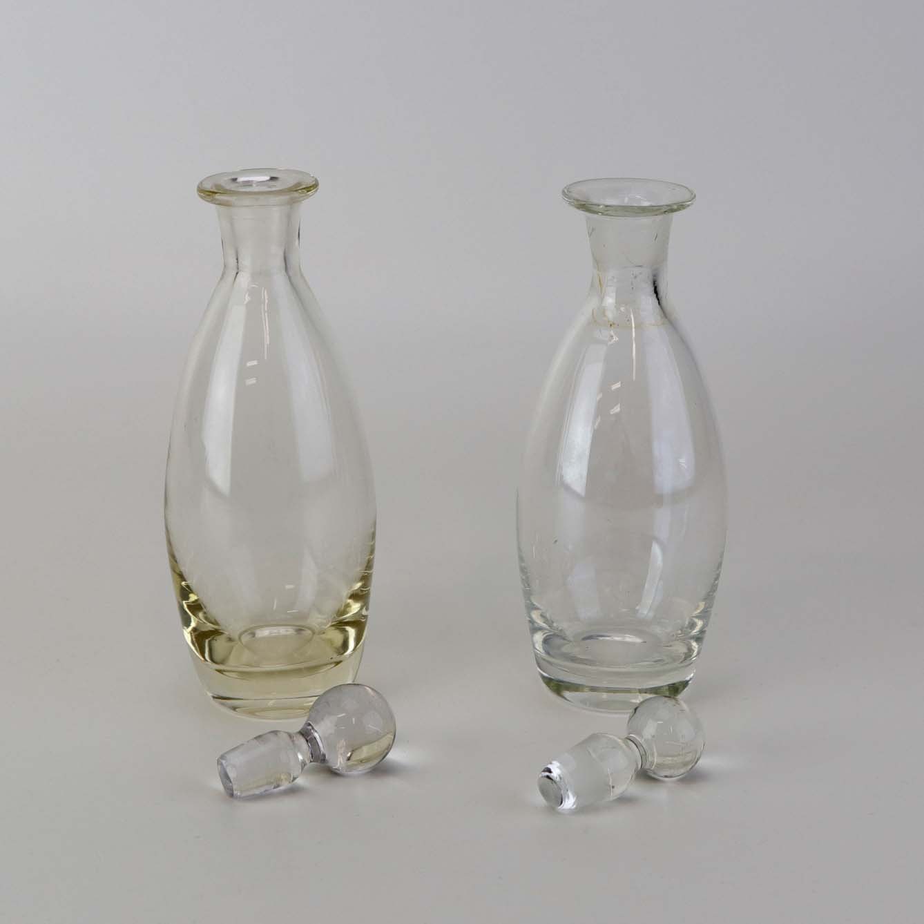 Fremstår med brugsspor glas ved den ene flaskehals.