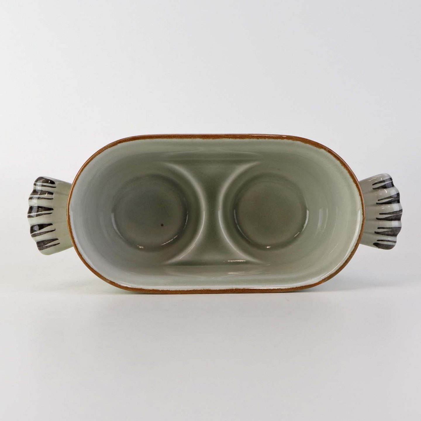 Sæt med to glasflasker til olie og eddike med prop i kar med hanke af fajance fra stellet Kirsten, som blev fremstillet i perioden 1934-1957.