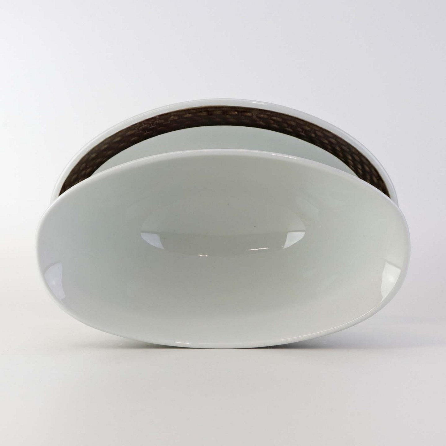 Fajancestellet med flettet kant og dekoration af brune blomster på lys baggrund med brun kant.