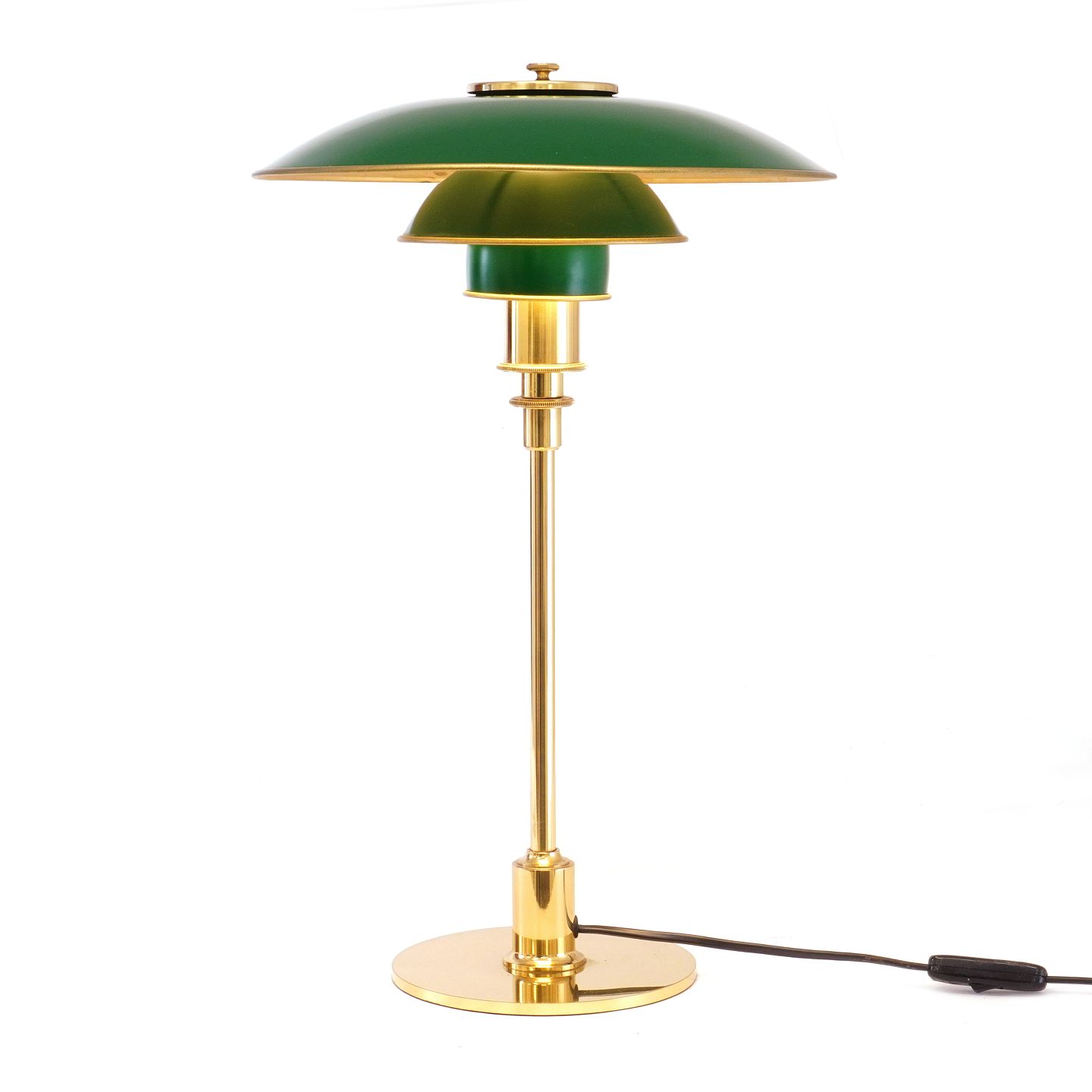 Poul Henningsen, 1894-1967: PH 3/2 bordlampe, med grønlakerede metalskærme og stel i poleret messing. Jubilæumsmodel