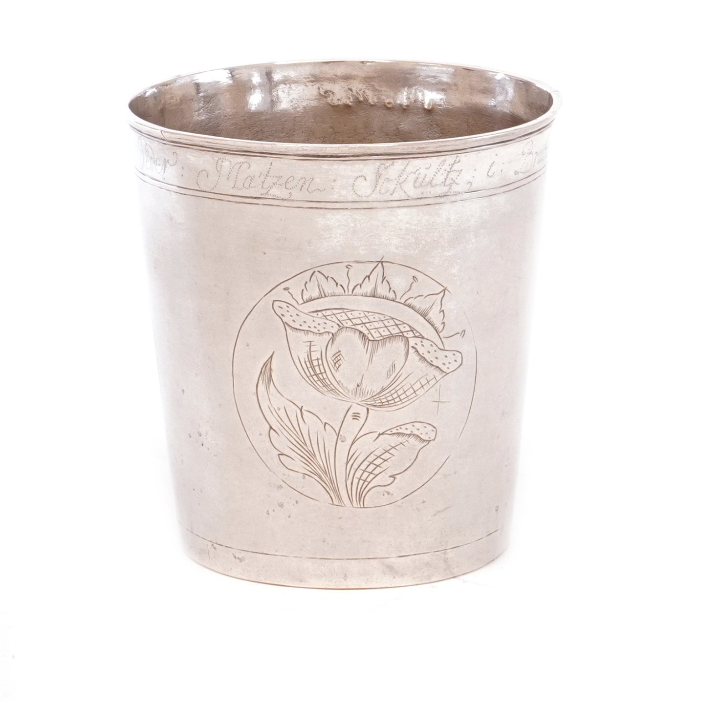 Barokt sølvbæger med dekoration i form af tre kartoucher med stiliserede blomster. Mester Wolf Petersen, Haderslev, 1746-63. H: 8,4cm |