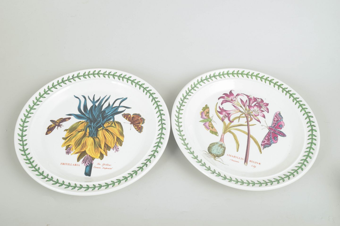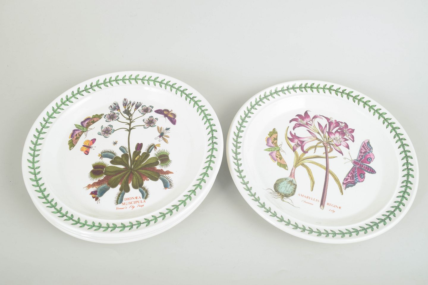 Sæt med 4 store middagstallerkener i fajance fra Portmeirion, dekoreret i “The Botanic Garden” serien med botanisk motiv og karakteristisk grøn bladbort.