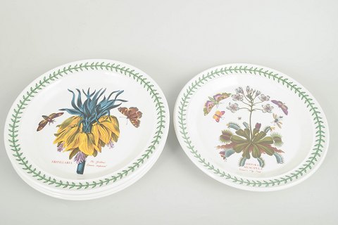 Sæt med 4 store middagstallerkener i fajance fra Portmeirion, dekoreret i “The Botanic Garden” serien med botanisk motiv og karakteristisk grøn bladbort.