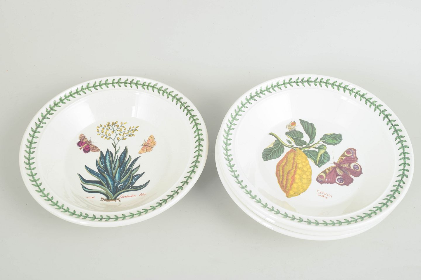 Sæt med 4 dybe tallerkener i fajance fra Portmeirion, dekoreret i “The Botanic Garden” serien med botaniske motiver og karakteristisk grøn bladbort.