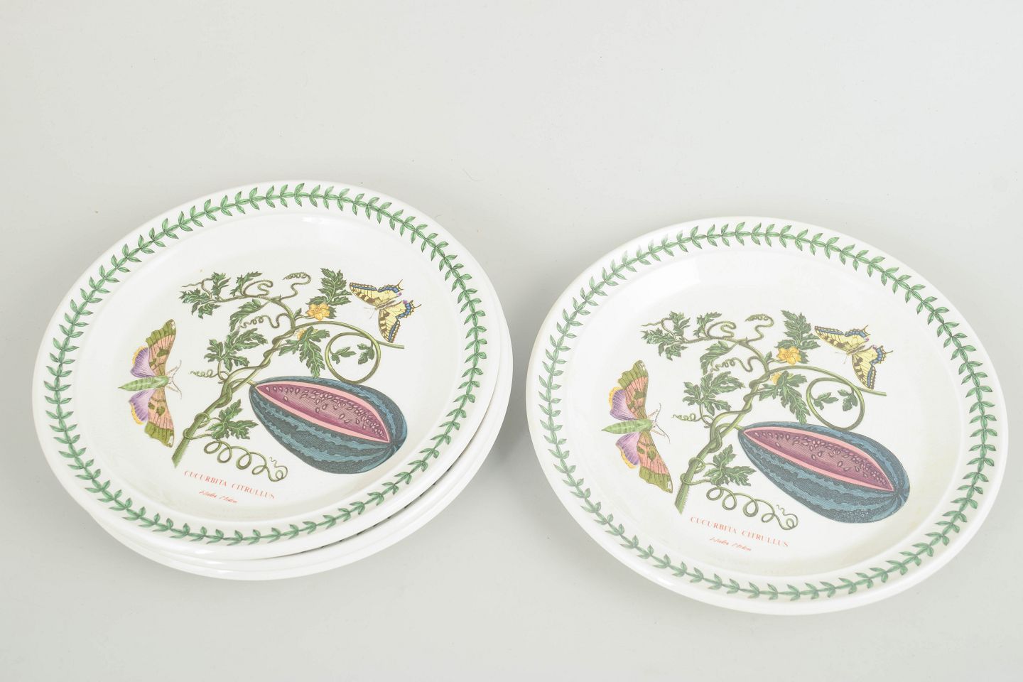 Sæt med 4 frokosttallerkener i fajance fra Portmeirion, dekoreret i “The Botanic Garden” serien med botanisk motiv og karakteristisk grøn laurbærbort.