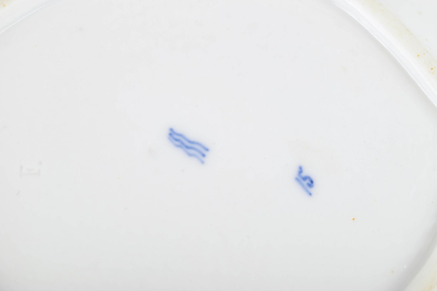 Sjældent antikt bladformet porcelænsfad med integreret hank, dekoreret i håndmalet koboltblåt underglasur i det klassiske Musselmalet Riflet mønster. Fadet har en markant skulpturel form med bølget rand og opdelt spejl, rigt udsmykket med blomster- og rankemotiver. Malerens nummer 15 er registreret som dekoratør. Modellen er udført i begyndelsen af 1800-tallet og repræsenterer et tidligt og usædvanligt eksempel på Royal Copenhagens formgivning.