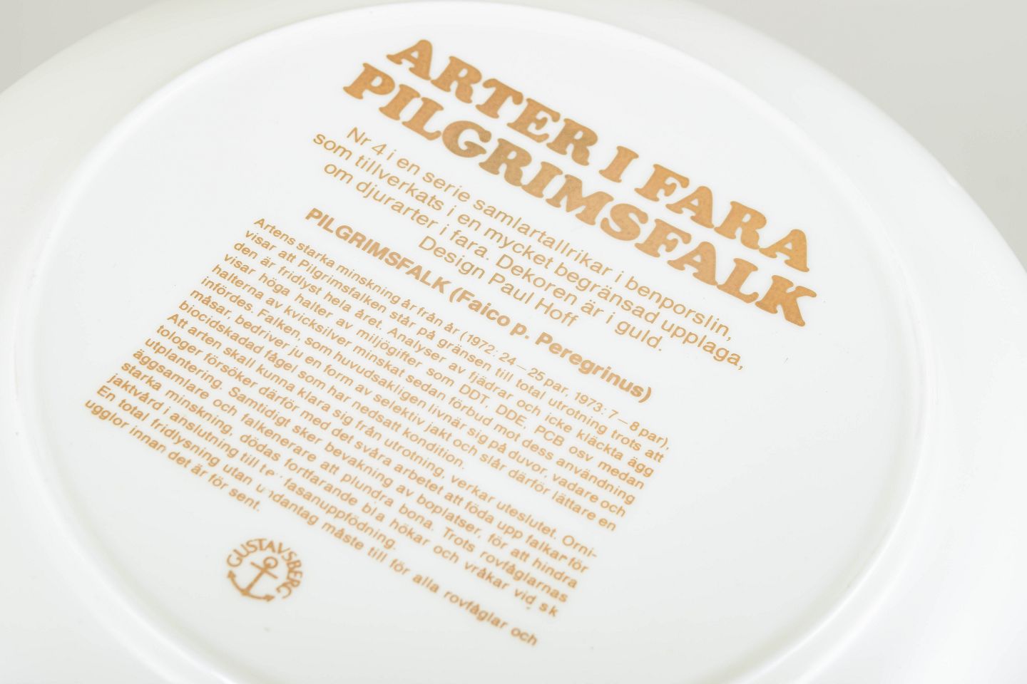 I 1980’erne lancerede Gustavsberg serien “Arter i fara”, som satte fokus på truede dyrearter gennem dekorative samlertallerkener. Serien kombinerer grafisk stærke naturmotiver med oplysende tekst og blev produceret i relativt begrænsede oplag, hvilket har gjort den populær blandt samlere af svensk porcelæn.