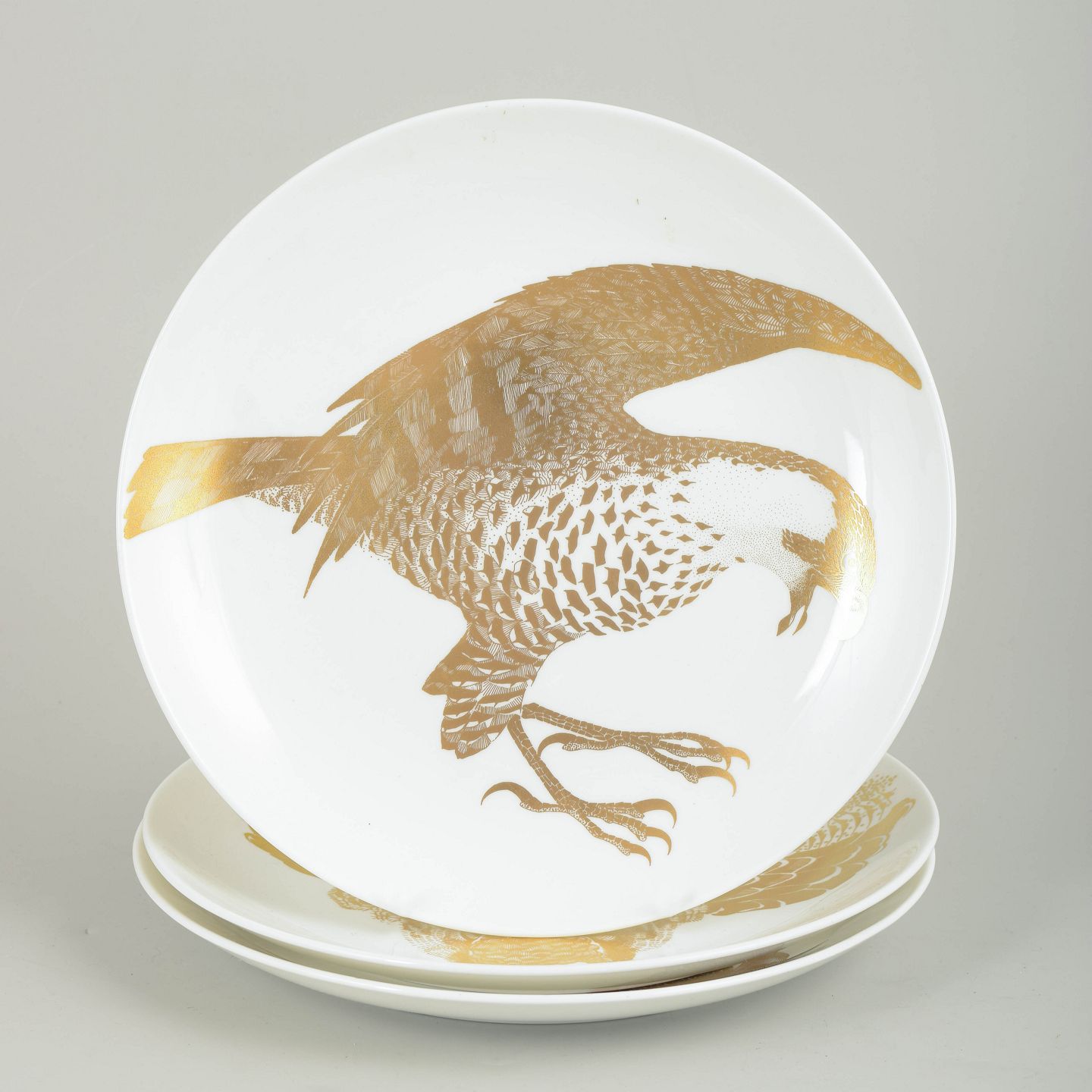 Dekorative samlertallerkener i porcelæn med motiv af havørne og ugle i gulddekoration. Bagsiden har trykt tekst med titel, serienummer og artsbeskrivelse.