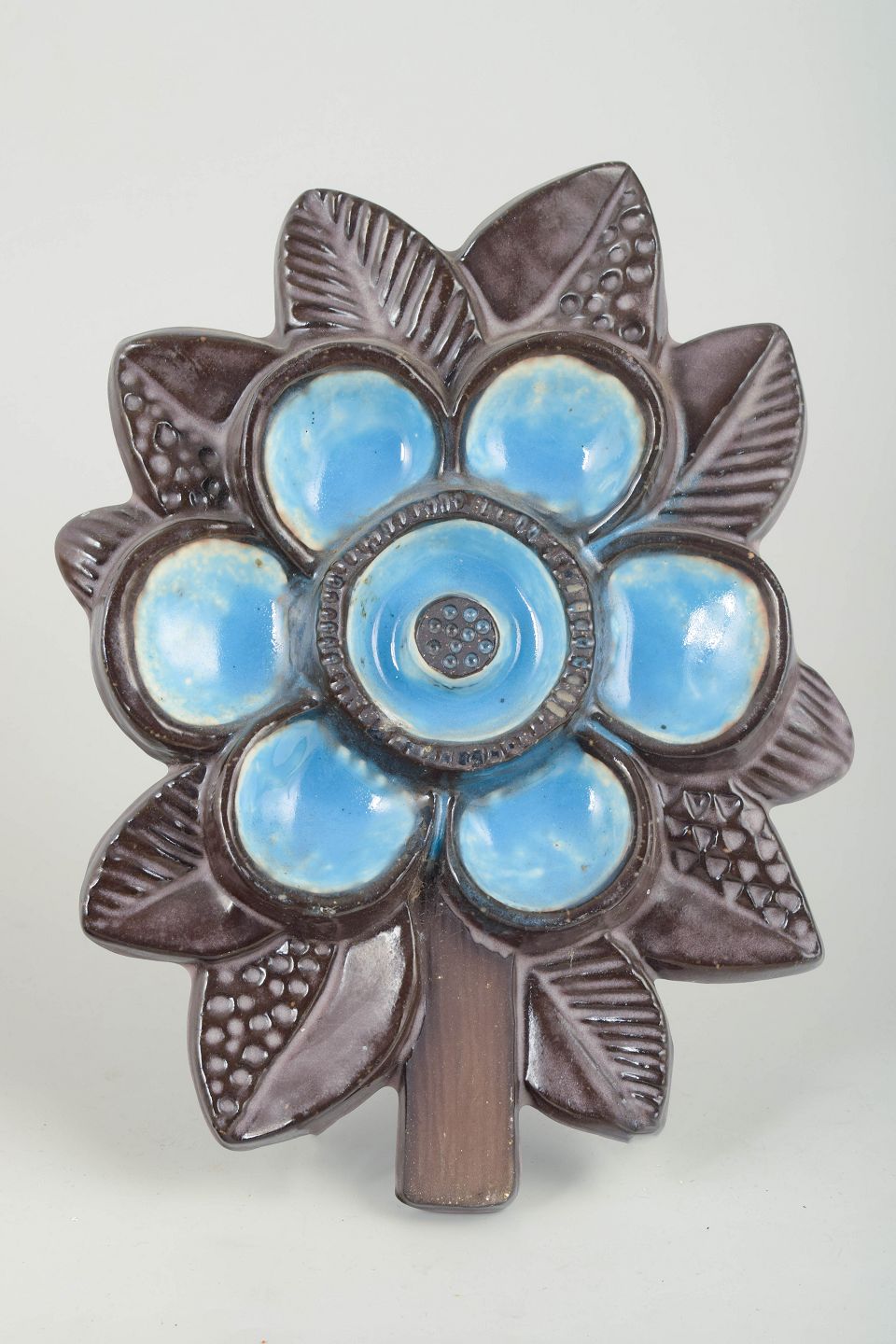 Dekorativt vægrelief i glaseret keramik formet som stiliseret blomst med bladmotiv. Relieffet er udført i brune toner med kontrasterende lyseblå, blankglaserede felter, der giver et markant og plastisk udtryk. Overfladen kombinerer relief, rytme og farvespil i et klart modernistisk formsprog. Modelnummer 1071.