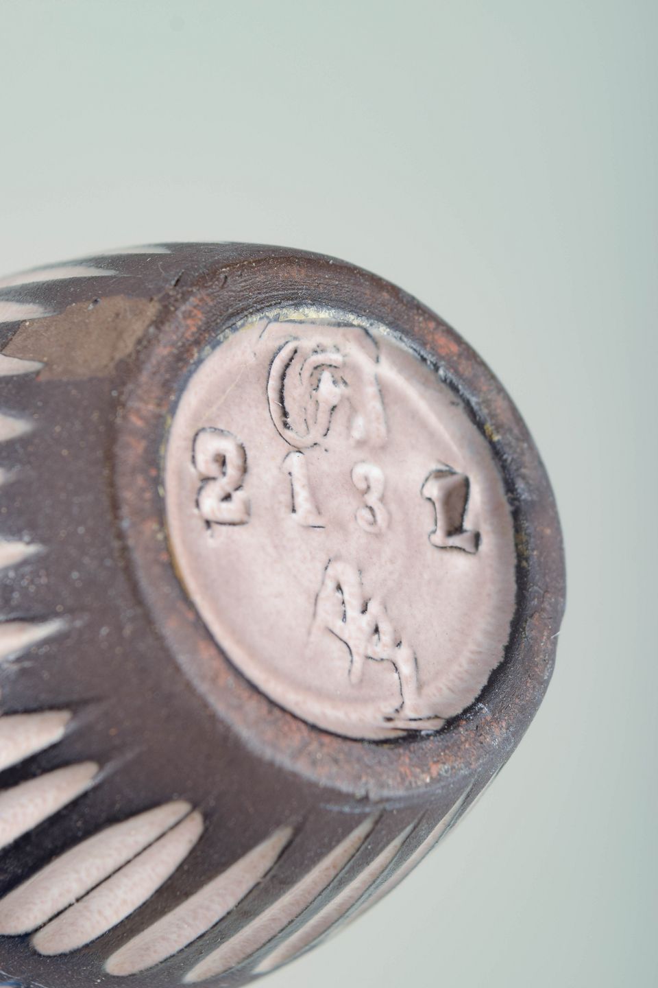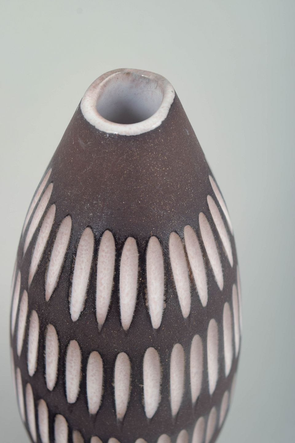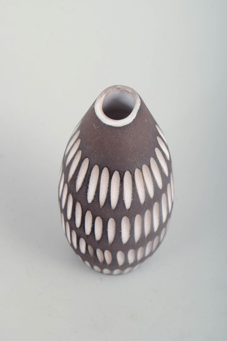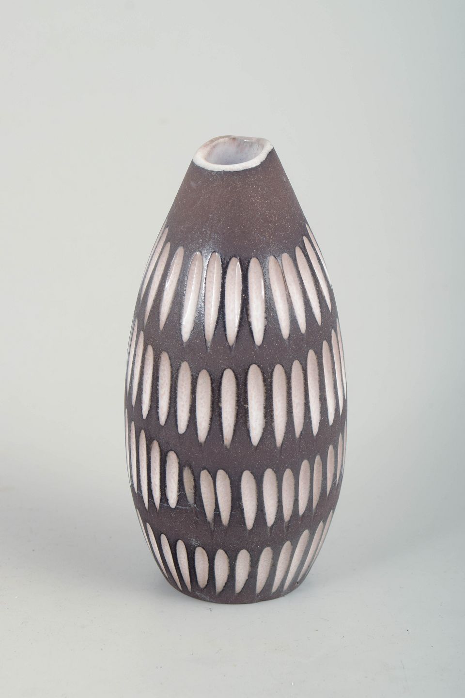 Slank, ovalt formet vase i glaseret keramik med smallende hals. Korpus er dekoreret med gentagne, lodrette ovale felter i hvid mod en mørk brun bundglasur, hvilket skaber et rytmisk og grafisk udtryk med tydelig skandinavisk modernisme. Modelnummer 2131.